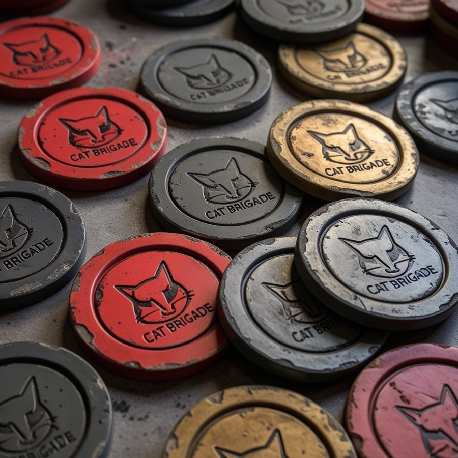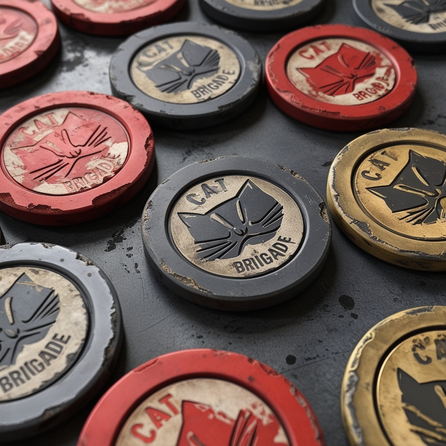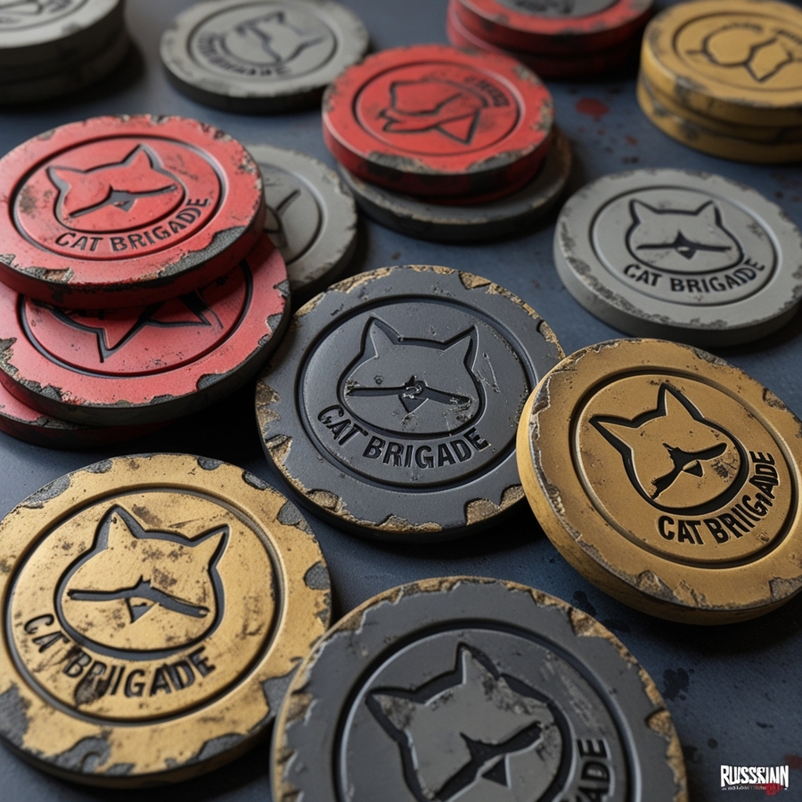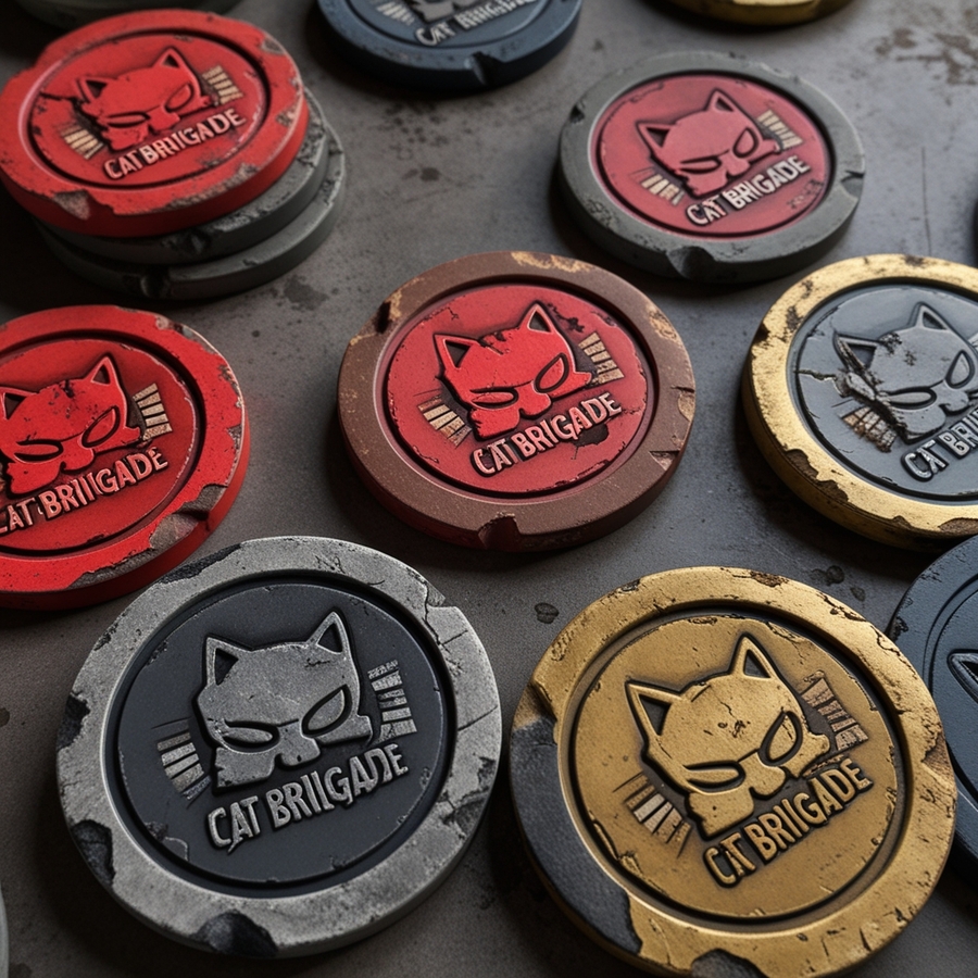 Chips: «Photorealistic image of playing chips for the board game 'Cat Brigade'. The chips are made of aged, worn plastic with rough edges, showing signs of use. They come in a variety of colors—gritty red, dark gray, and faded gold—with street-inspired designs. Each chip is embossed with a stylized cat symbol, resembling a street gang insignia, and a rough, weathered texture that fits the post-Soviet 90s Russian setting. The chips are scattered across a table, with some showing signs of wear, giving them an authentic, lived-in feel. The chips have a slightly glossy finish with subtle grime and wear marks.»