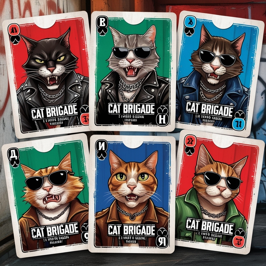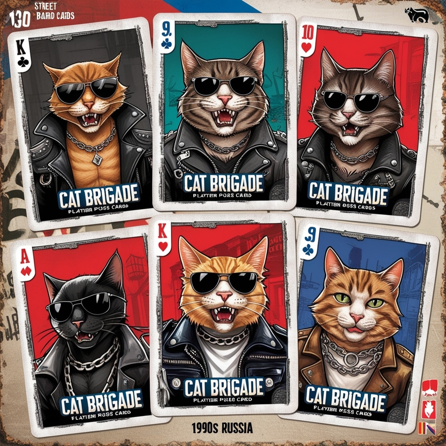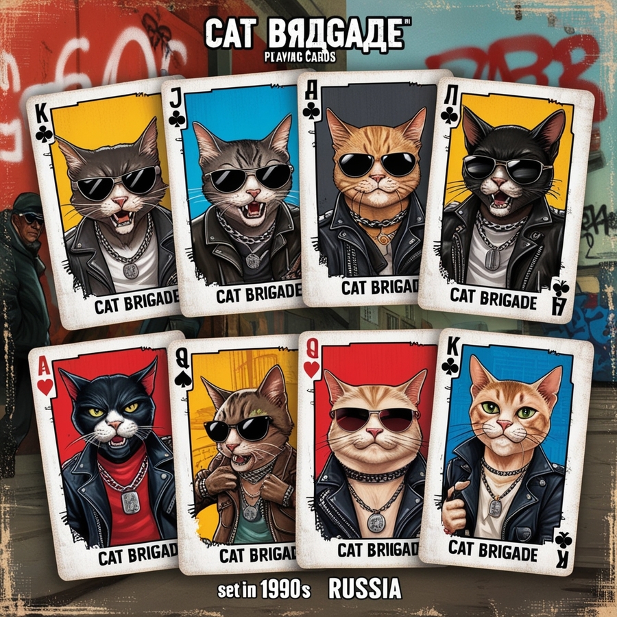 Playing Cards: «Photorealistic image of playing cards for the board game 'Cat Brigade' set in 1990s Russia. The cards feature illustrations of tough, street-smart cat characters with leather jackets, chains, and sunglasses. Each card shows a cat with a unique expression and pose, conveying their personality—some aggressive, some sly, others cunning. The design is gritty and worn, with a vintage, post-Soviet aesthetic. The background includes faded graffiti and urban street elements. The card borders are distressed, and the cards have a slightly weathered look, as if they’ve seen many street battles. The font is bold, with Cyrillic text and street art-inspired typography.»