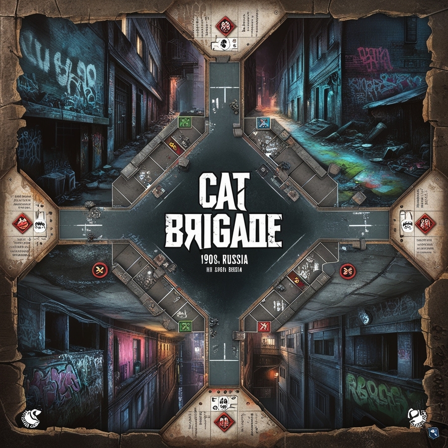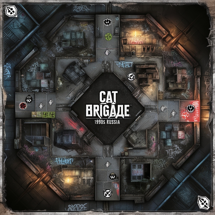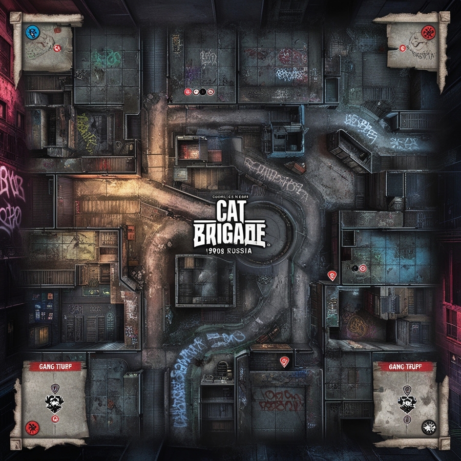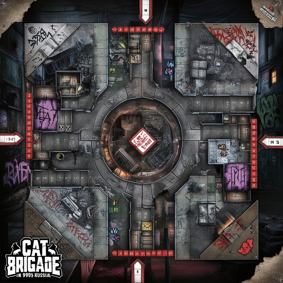Playing Field: «Photorealistic image of the playing field for the board game 'Cat Brigade', set in 1990s Russia. The board is a detailed map of a gritty urban landscape, with winding streets, alleyways, and abandoned buildings. It has a dark, atmospheric feel, with a sense of decay and neglect. Graffiti covers the walls, and neon lights cast an eerie glow over the streets. The board is slightly worn, with frayed corners and a vintage texture, giving it a battle-hardened, post-Soviet look. Each section of the board has specific zones for gang turf, and scattered around the board are marked spots where players can interact, represented by worn-out symbols and Cyrillic text. The overall design reflects the harsh, rebellious atmosphere of Russian street culture in the 90s.»