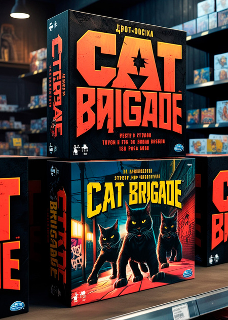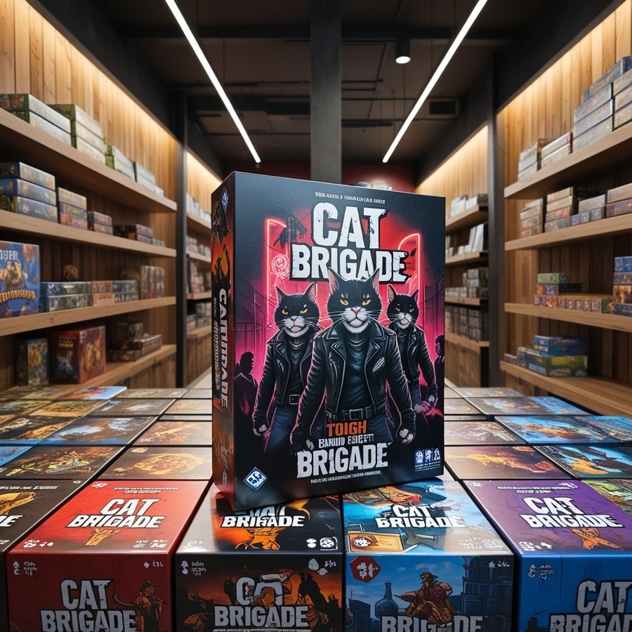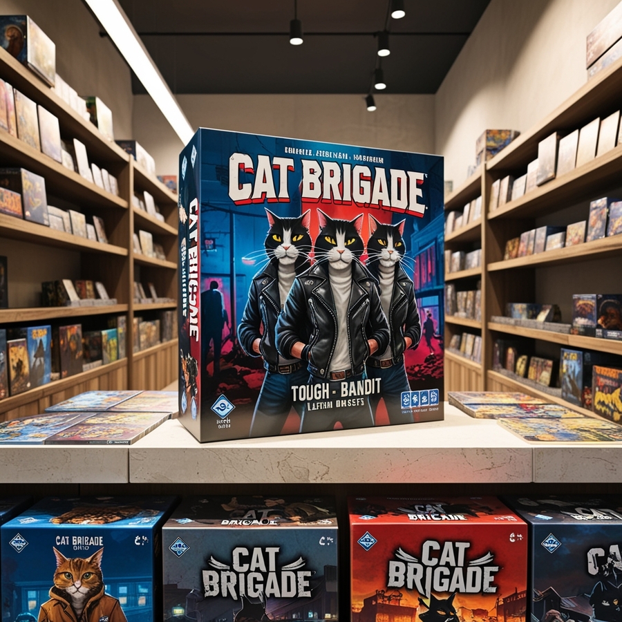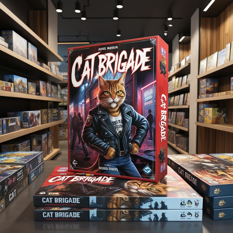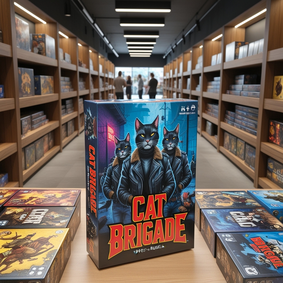 Photorealistic image of the board game 'Cat Brigade' displayed on store shelves. The scene takes place in a well-lit retail space, with rows of shelves filled with various board games. In the foreground, the 'Cat Brigade' box is prominently featured, with its gritty, 1990s Russia-inspired design. The box is glossy, with bold, street-style graphics of tough, bandit cats in leather jackets, surrounded by urban decay and neon lights. The store has a modern yet slightly worn atmosphere, with wood-paneled shelves and scattered game boxes, some of which are slightly tilted or stacked haphazardly, giving a lived-in feel. Other game boxes around it reflect the diversity of board game themes, but 'Cat Brigade' stands out with its bold and unique design. The lighting casts a soft glow on the packaging, emphasizing the vivid colors and detailed artwork, while the background showcases customers browsing the shelves, giving a sense of real-world retail experience.