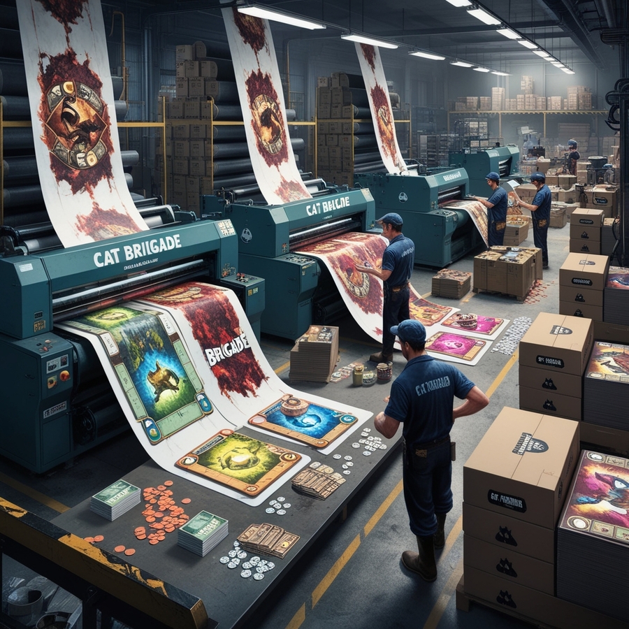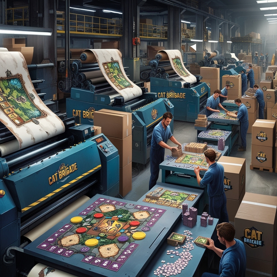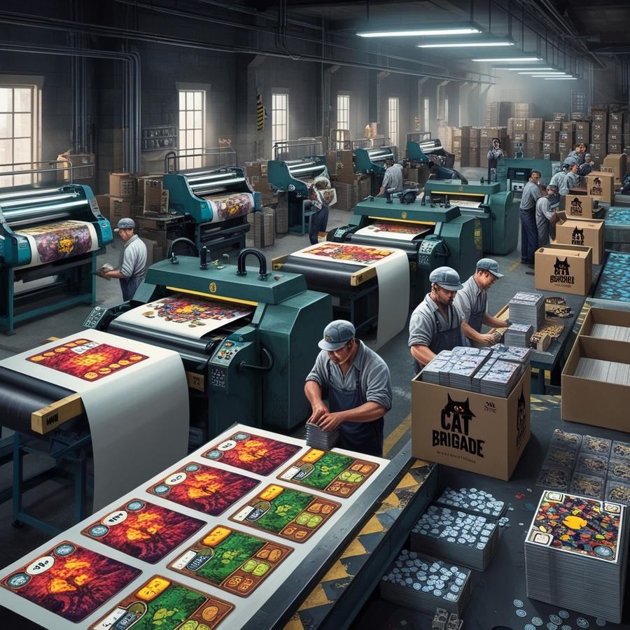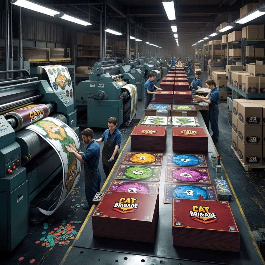Photorealistic image of the manufacturing process for the board game 'Cat Brigade' in a factory or print shop. The scene shows workers in a large industrial space surrounded by machines printing the game components. The factory is filled with large printing presses, cutting machines, and packaging stations. Sheets of thick, high-quality paper with vibrant, gritty designs of the game’s cards, board, and chips are being fed into the machines. In the background, partially assembled boxes of the game are stacked, with the 'Cat Brigade' branding visible. The atmosphere is busy and filled with the hum of machinery. Some workers are wearing factory uniforms, while others are focused on carefully inspecting the printed designs and assembling the game components. The space has a realistic, factory ambiance, with dim lighting, metal shelves, and visible details like ink stains and machinery tools, evoking the hard-working and industrial process of bringing the board game to life.