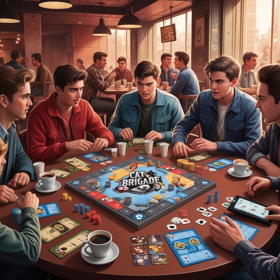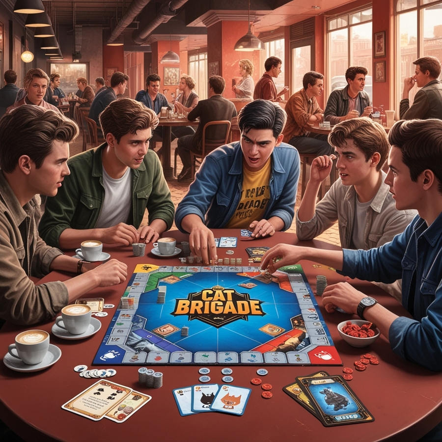 Photorealistic image of a competitive group playing the board game 'Cat Brigade' in a bustling café. The table is filled with coffee cups, snacks, and game components like playing cards, chips, and cat tokens. The group, composed of young adults, is engaged in a tense moment of the game, with one player looking at the board while another adjusts their character tablet. The background shows café patrons enjoying their drinks and conversations, with a modern yet slightly worn-down aesthetic, reminiscent of the 1990s. The game’s urban, post-Soviet design stands out against the warm tones of the café’s interior