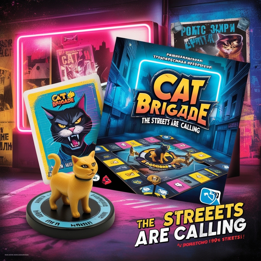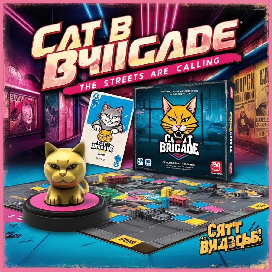 Photorealistic promotional poster for 'Cat Brigade', capturing a retro 1990s Russian vibe. The poster features a collage of game elements: a cat token in the foreground, a card with a tough cat character, and the game board with its urban street design. The background is a blend of neon lights, VHS-style visuals, and faded posters, reminiscent of the 90s. The game’s title 'Cat Brigade' is displayed in bold, retro-style Cyrillic font, with a nostalgic tagline, 'The Streets Are Calling', highlighted with a grainy, vintage effect. The colors are vibrant, with a blend of neon pinks, blues, and yellows, giving it an authentic 90s street style.