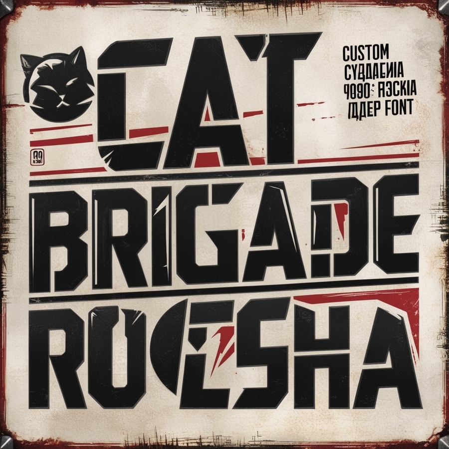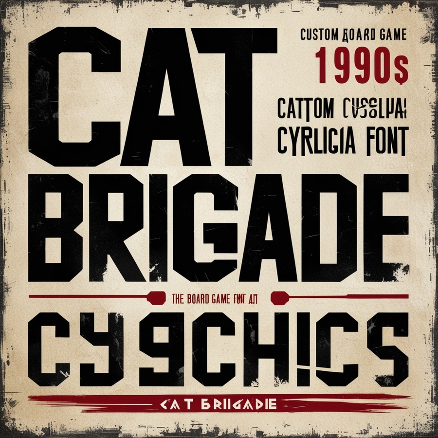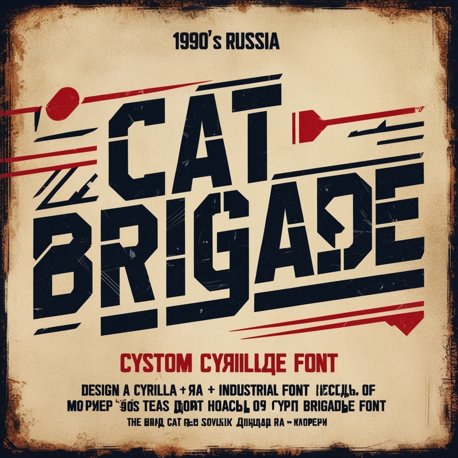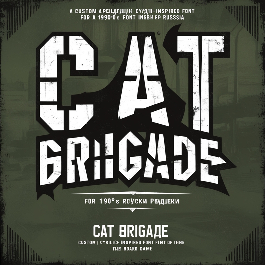 Design a custom Cyrillic-inspired font for the board game 'Cat Brigade', capturing the essence of 1990s Russia. The font should be bold and industrial, with elements that hint at the Soviet-era influence, but with a modern twist to reflect the chaos of the post-Soviet 90s. The characters should have strong, straight lines with subtle curves and sharp angles, creating a mix of utilitarian and rebellious vibes. The design should incorporate a slightly distressed look, as if the font was printed on old, worn-out paper or a faded street sign. The overall style should be rugged, with a gritty, urban feel.