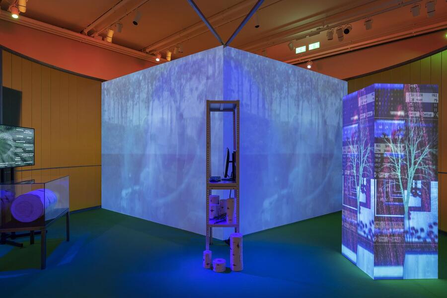 Инсталляция «Birtch √0» сталкивает сказочный сюжет с цифровой реальностью. Мифологические персонажи — русалка, мать-кукушка, пень — теряют свою целостность, становясь фрагментами нового общего сюжета о некой секретной лаборатории.