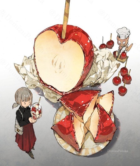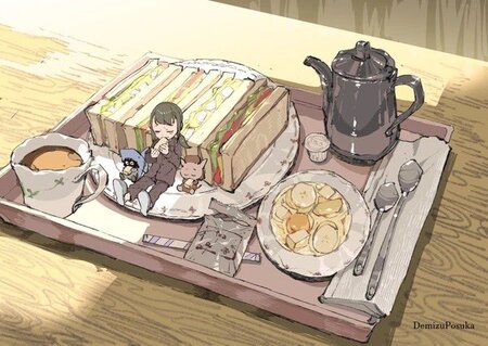 Я решила начать с частой темой в работах Посуки — трапезы (гипертрофированные размеры еды, утвари по отношениюк детям)