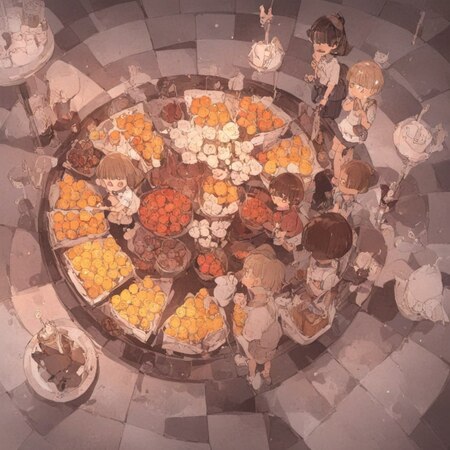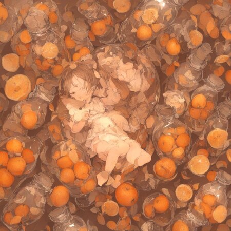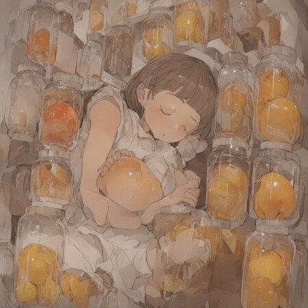 Далее я попробовала смешать с 20% стандартной нейронки и изображение стекла начало походить на то как Посука рисует в своих артах. На данном этапе мне понравилось то, как сгенерировались рюши и оборки на сорочке девочки, однако фрукты начали выглядеть слишком натуралистично, как фотобаш. И все также девочка спят не внутри банки (сеть решила, что хочет положить не одного, а двух детей).
