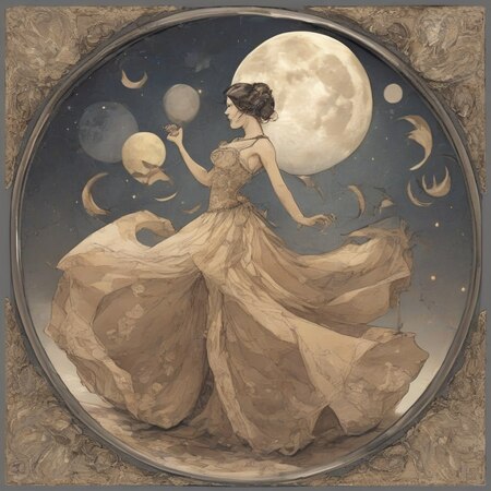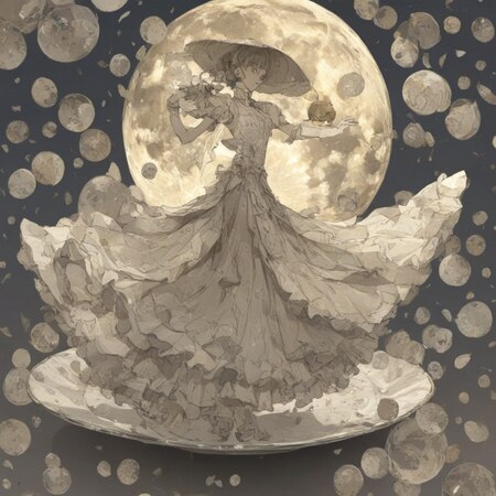 prompt: photo collage in Posuka Demizu style, Lady in ball dress dancing under the moon on plate