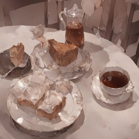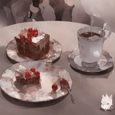 photo collage in Posuka Demizu style, a cup of tea in the background, plate with a piece of cake and two children staying on this plate on the foreground