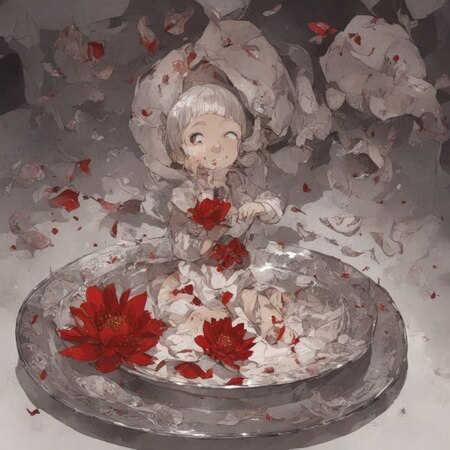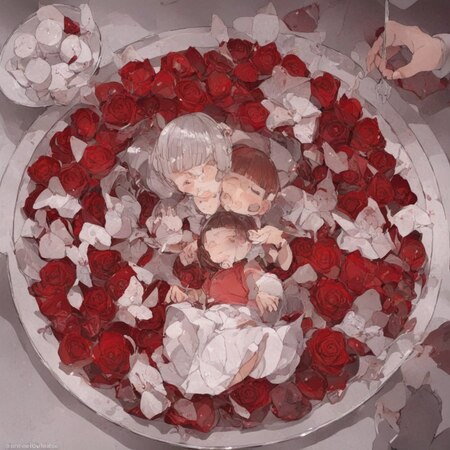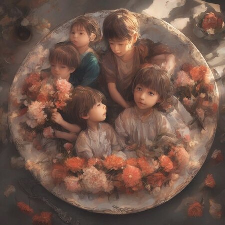 слева — чекпоинт 250 + 20% // справа — чекпоинт 500 +20% prompt: photo collage in Posuka Demizu style, a plate full of flowers with three kids staying on it with dramatic lighting