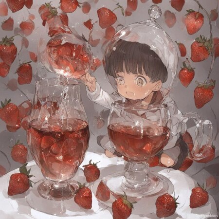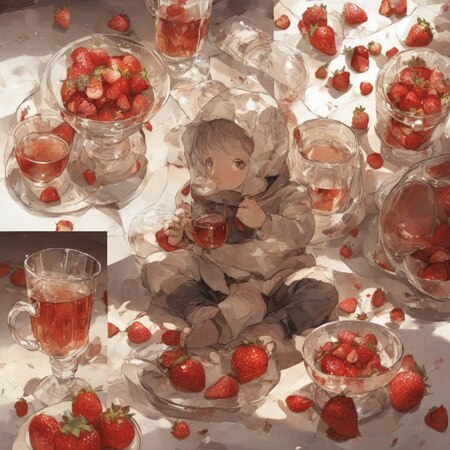 photo collage in Posuka Demizu style, little boy lays near a huge glass cup filled with tea among strawberries some on the floor