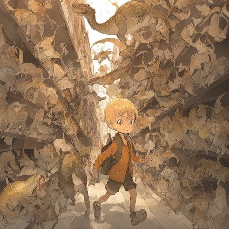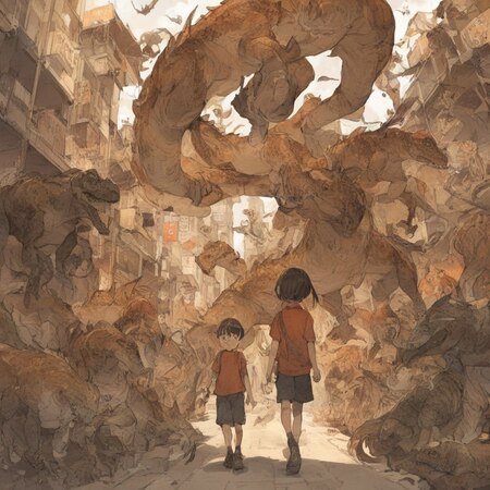 prompt: photo collage in Posuka Demizu style, china town with boy walking among a bunch of reptile like monsters