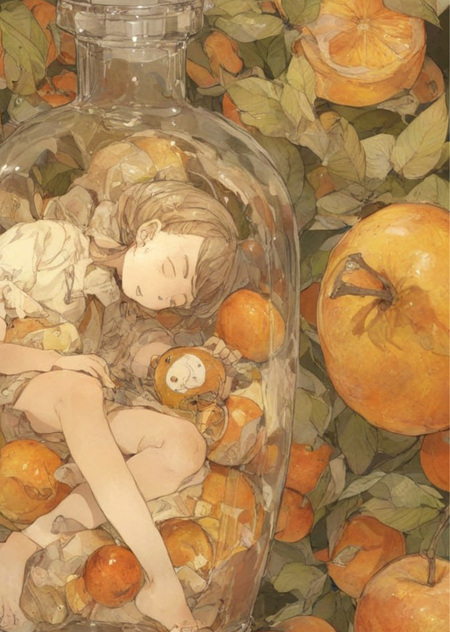 prompt: photo collage in Posuka Demizu style, a sleeping girl in bottle with fruits (ура.)