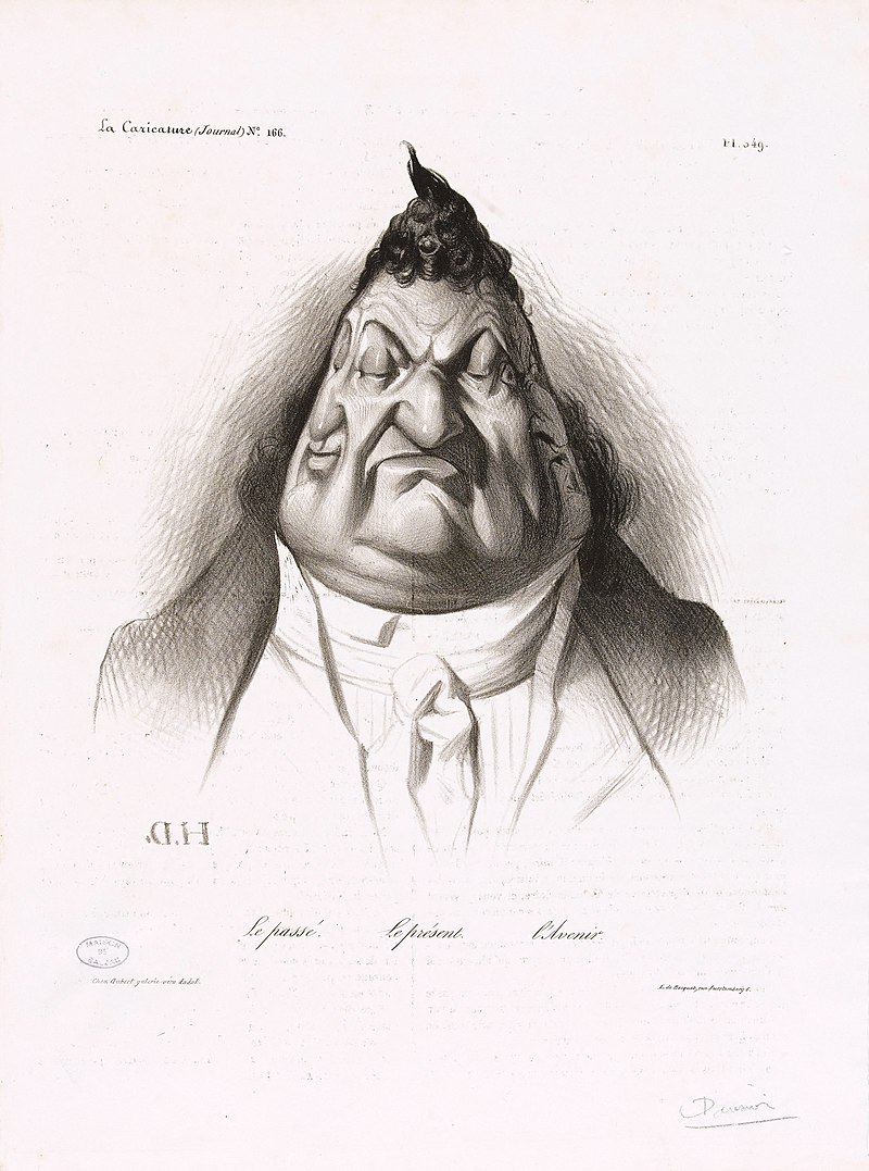 Портрет/шарж безусловно, является главным жанром в сатире. Тесно связанный с театром Оноре Домье при создании сатирических портретов опирался на концепцию маски. Маска (будь то ритуальная или театральная) с самого зарождения этого элемента жизни «человека играющего» действительно строилась по законам гротесковой гиперболизации или, напротив, условной минимализации отдельных черт лица. И в этом смысле мы вполне можем относиться к литографиям Домье как к маскам. В то же время маска — это всегда отбор и обобщение некоторых человеческих свойств и качеств внешности до внеличностных, типических, до некоего архетипа. То есть она предполагает достаточно высокую степень отстраненности от конкретных частностей. Подход Домье к сатирическому портрету так же экспрессивен, как в его минималистических композициях с людьми во весь рост, а методы стилизации, например, большие головы, актуальны для карикатуристов до сих пор.