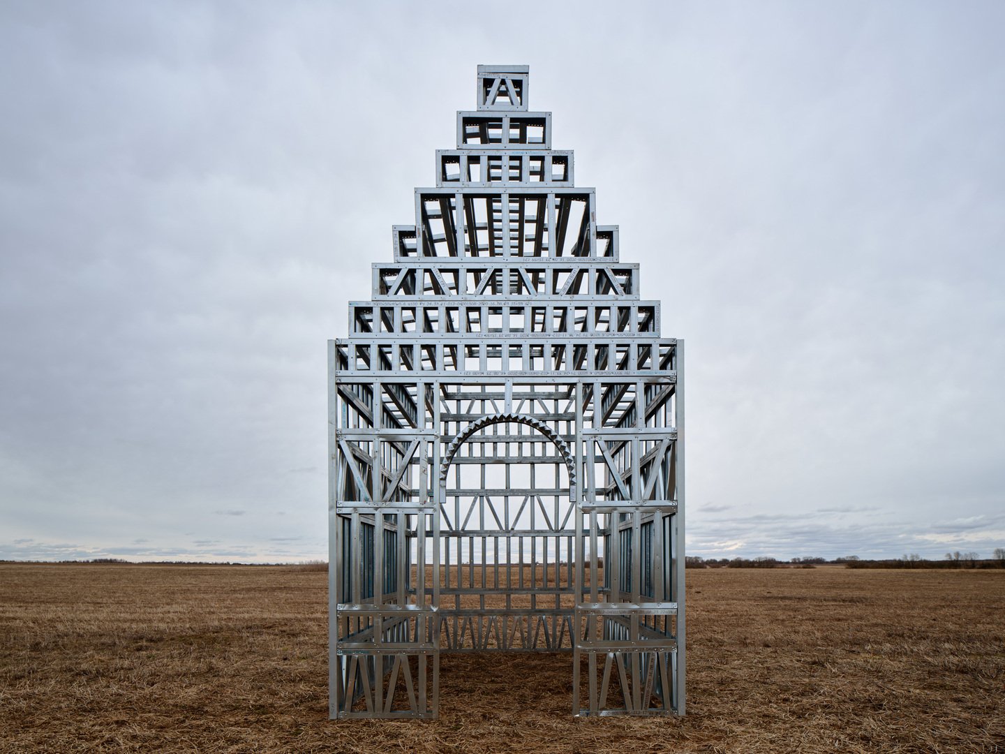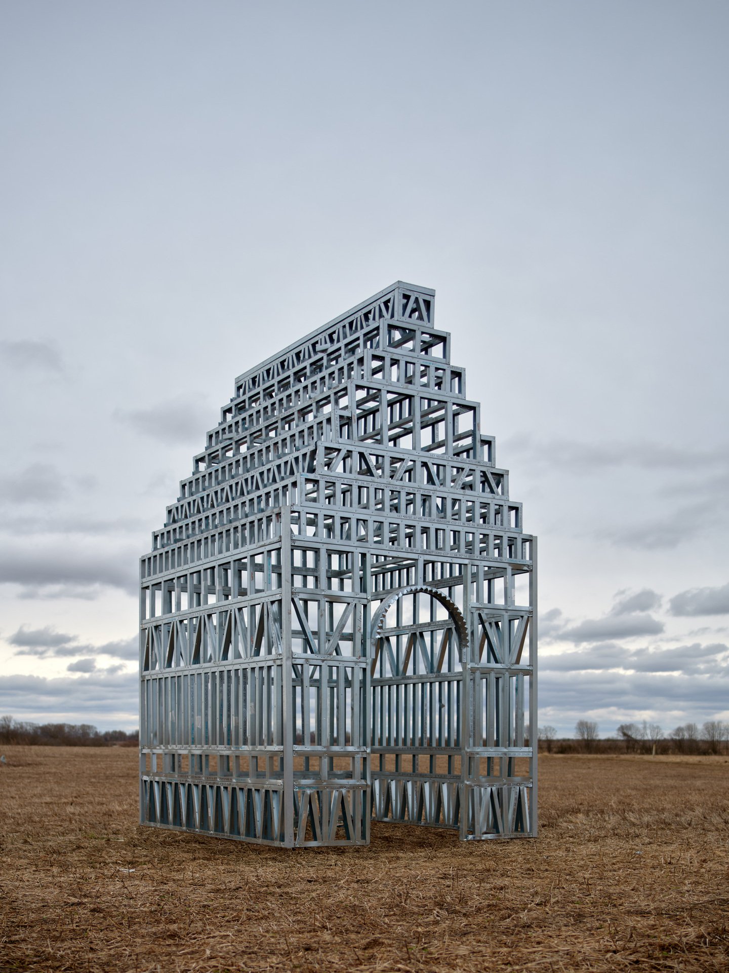 In the open fields near the village of Menchakovo, just outside Suzdal, an unfamiliar structure cuts through the horizon — a silhouette of metal ribs, reminiscent from afar of a skeletal house with a pitched roof. This installation, conceived by Le Atelier under the direction of architect Sergey Kolchin, is called the Temple of the Laborers. Originally created for the 2023 Zodchestvo Festival of Architecture, its story did not end with the exhibition, as is so often the case with experimental display design.