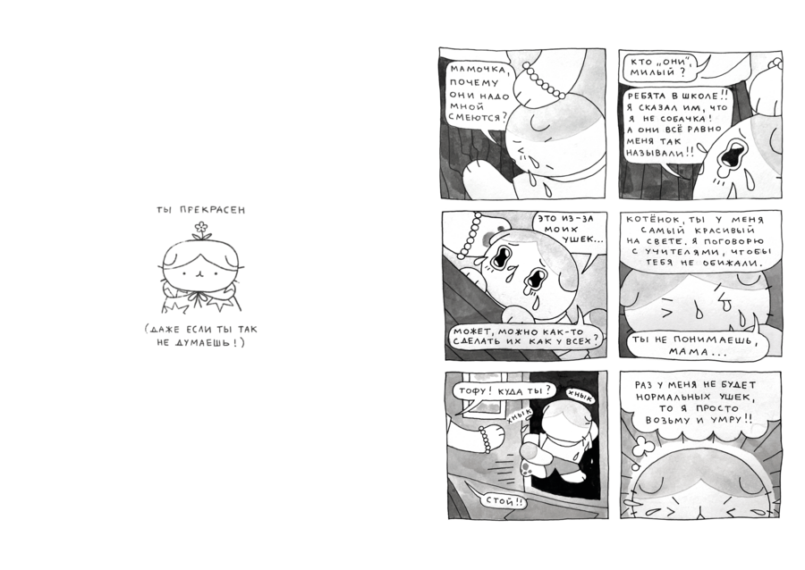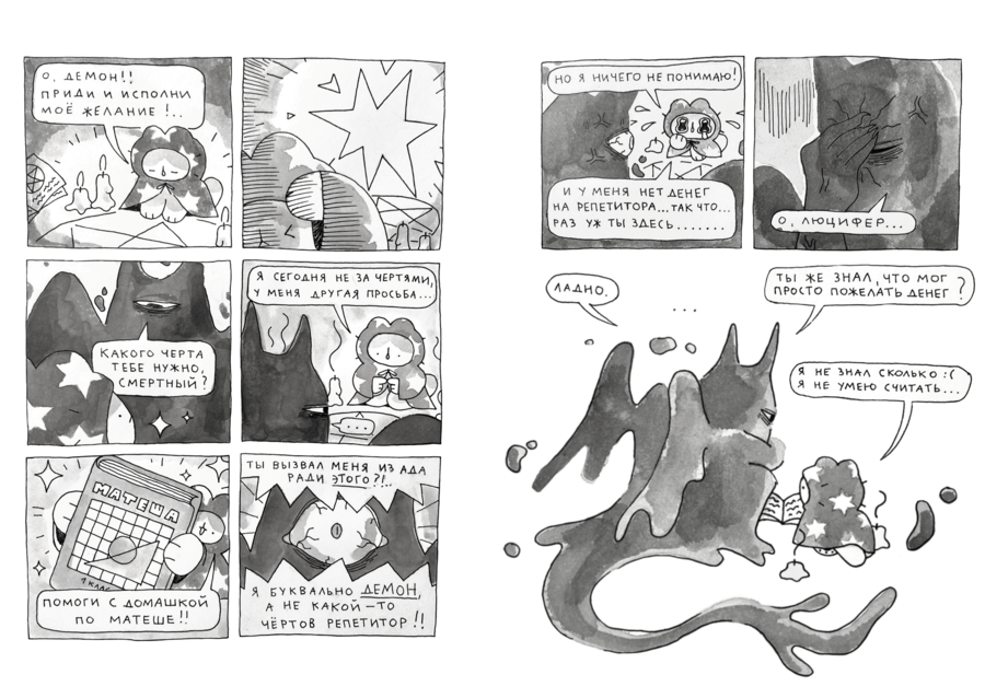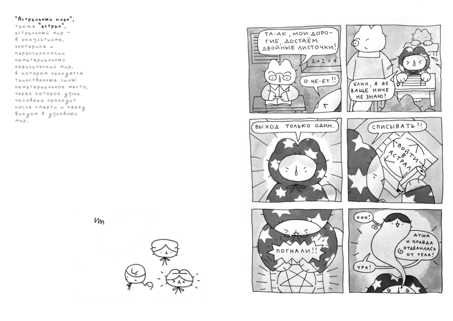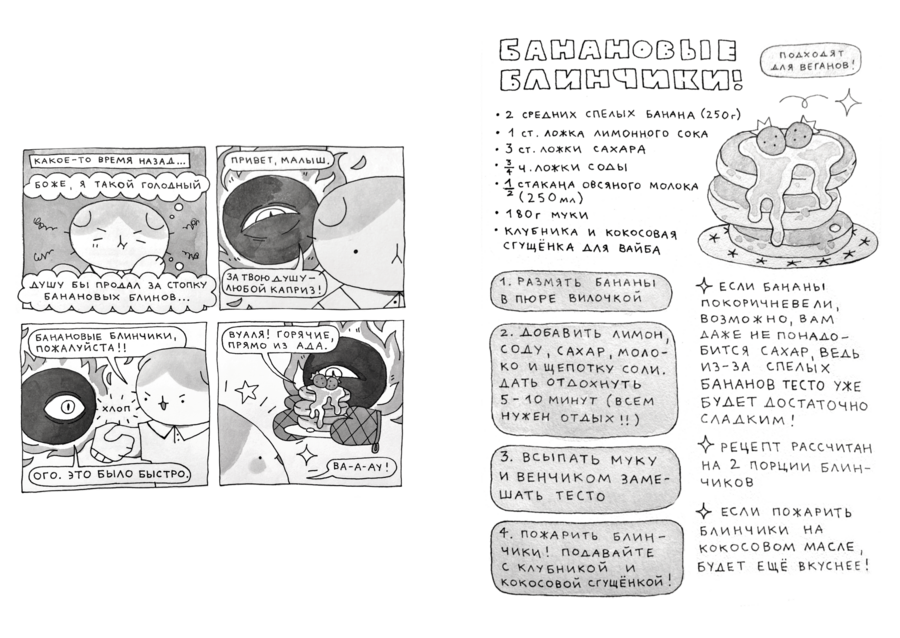 Внутри вы найдёте несколько забавных комиксов, немножко размышлений на тему комплексов и, неожиданно, рецепт банановых блинчиков…