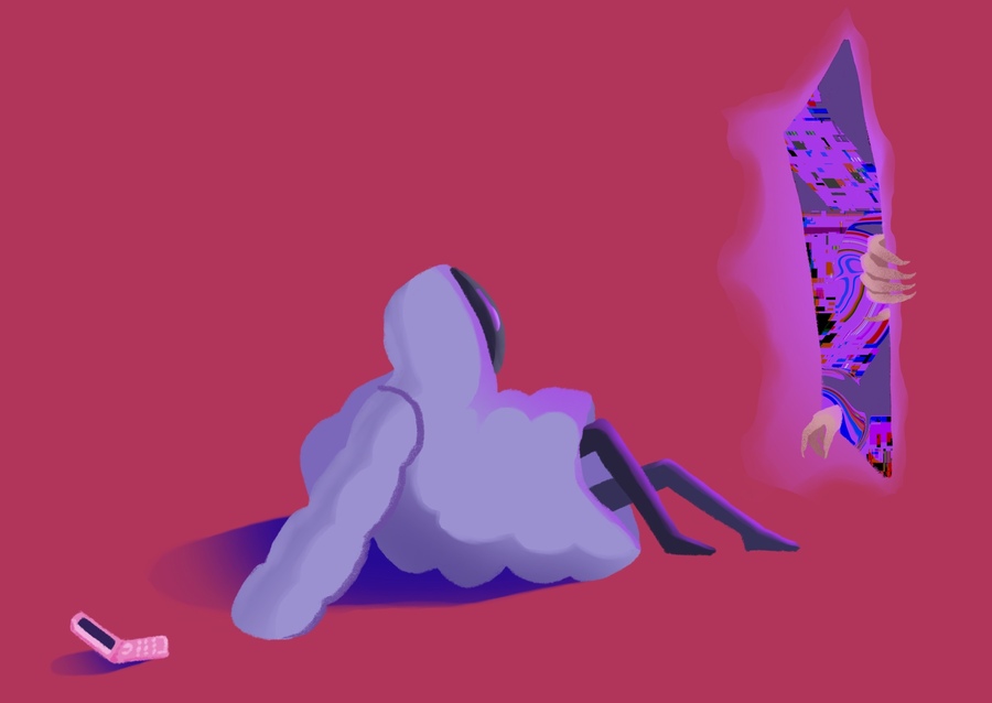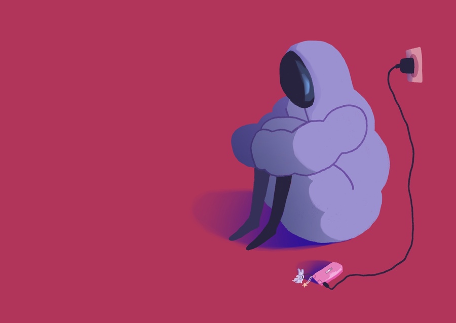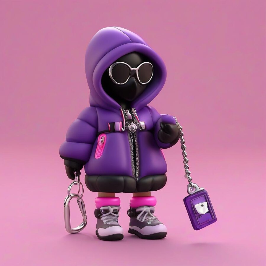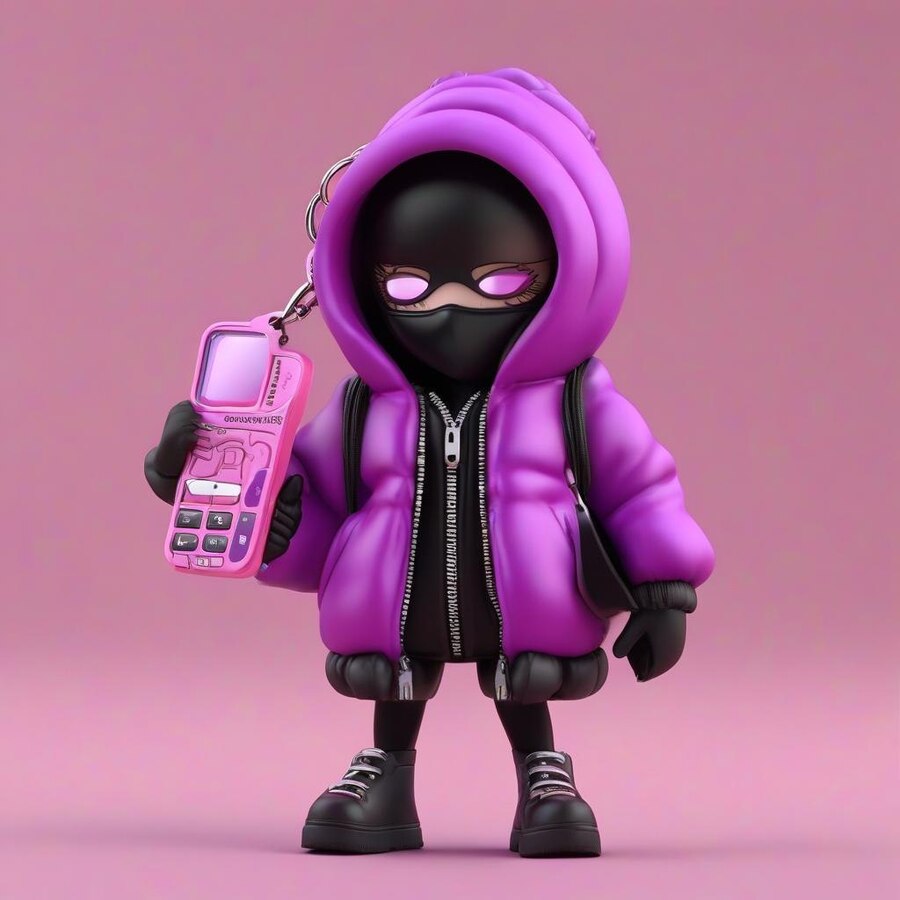 the cartoon female character is wearing a purple puffy jacket, with the hood is a glass mask, which covers the face. the character has small cartoon legs of dark color, in her hands she holds a phone