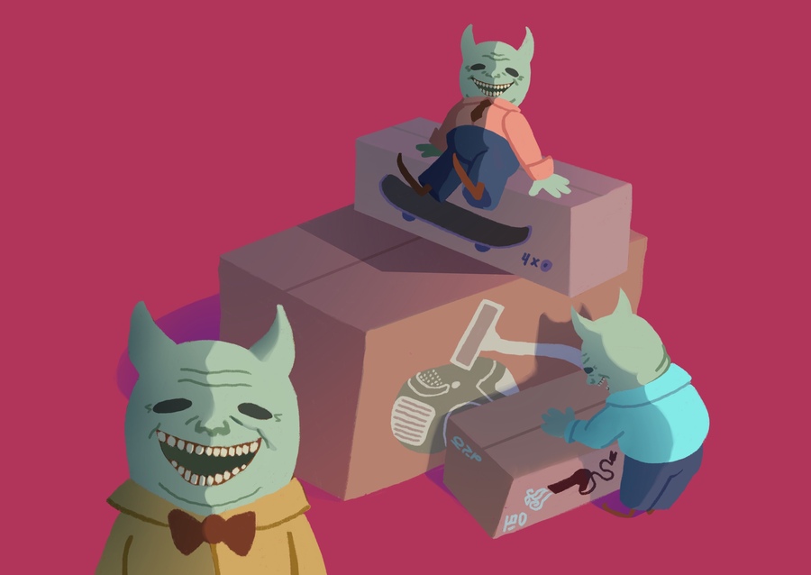 Упаковка должна отражать стиль игры, поэтому для картонных коробок и пакетов для покупок использовались телевизоры 80-х годов как референсы.