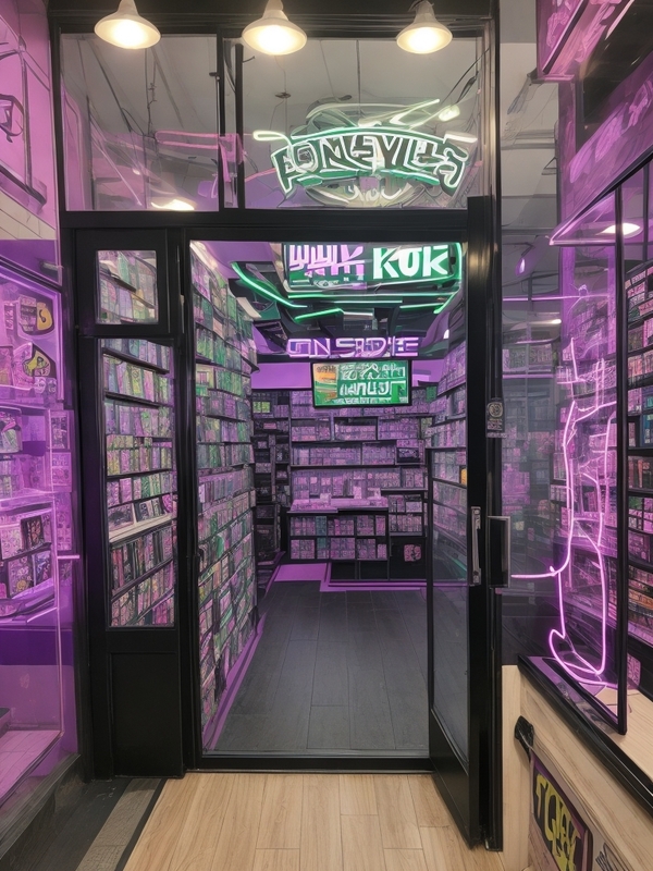 Game store, dark green lighting, empty black racks, purple neon elements, sign on glass door that reads TV show korean punk aesthetics