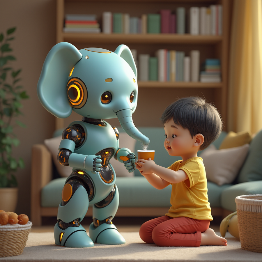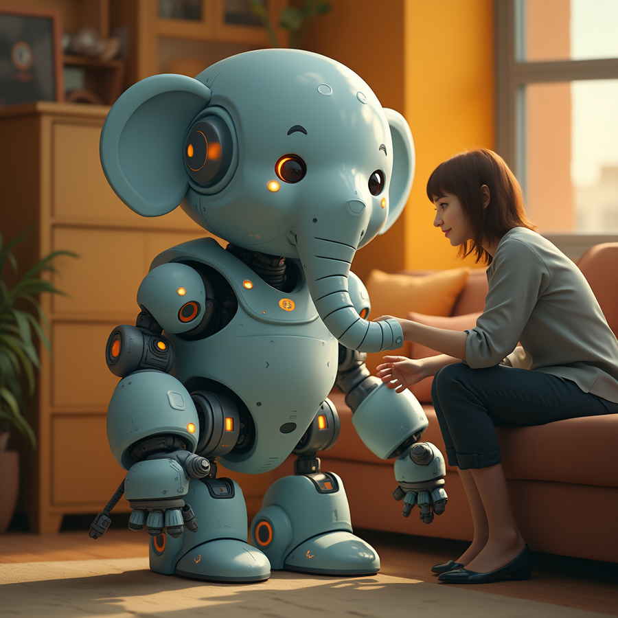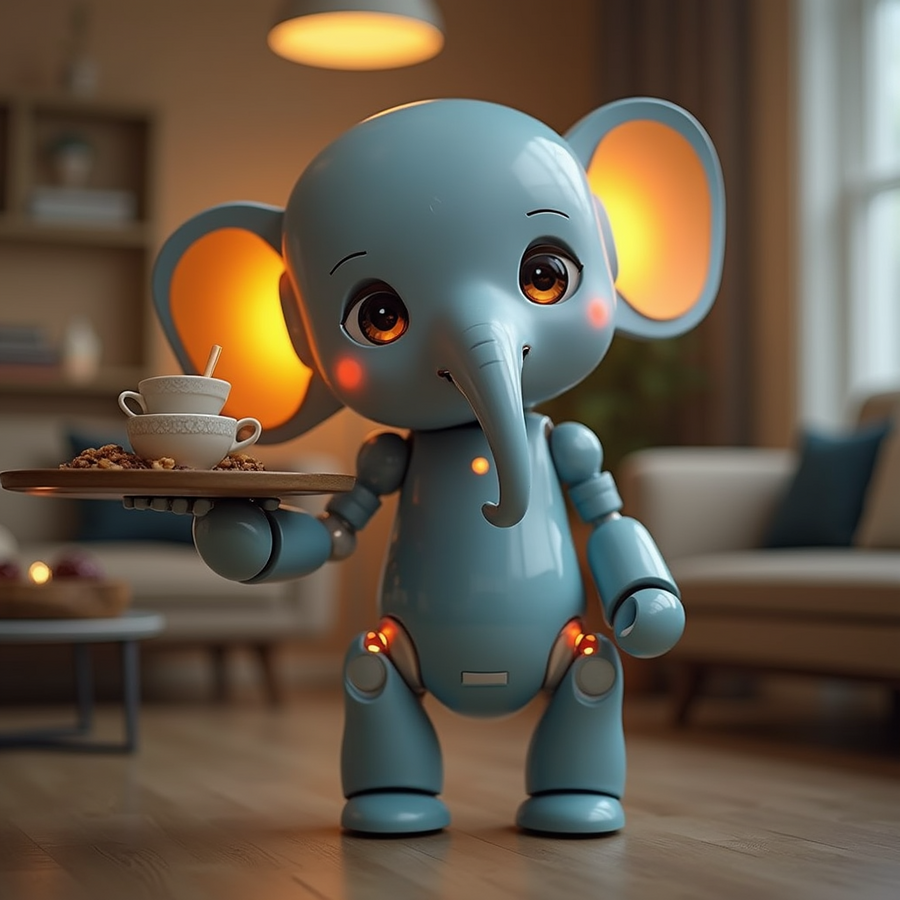 Create an image of a cute, friendly robot elephant designed to assist humans with daily tasks. The robot has a minimalist design with smooth, rounded edges, exuding a calm and approachable personality. Its sleek and modern appearance highlights harmony and balance, with a primary color palette of cool blues (#82b1ff, #2962ff) for the body and warm orange and yellow accents (#ff6f00, #ffc400, #ffe351). The elephant is human-sized with soft LED lights embedded in its joints, trunk, and eyes to emphasize its functional yet calming nature. Show the robot interacting with a human in a cozy, everyday setting — perhaps handing over a coffee mug, organizing books, or helping with a task like folding laundry. The background should feel warm and inviting, complementing the robot’s friendly design.