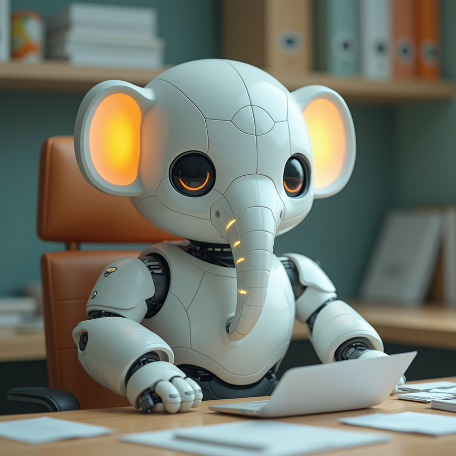 Create an image of a cute, friendly robot elephant designed to assist humans with daily tasks. The robot has a minimalist design with smooth, rounded edges, exuding a calm and approachable personality. Its sleek and modern appearance highlights harmony and balance, with a primary color palette of cool blues (#82b1ff, #2962ff) for the body and warm orange and yellow accents (#ff6f00, #ffc400, #ffe351). The elephant is human-sized with soft LED lights embedded in its joints, trunk, and eyes to emphasize its functional yet calming nature. Show the robot interacting with a human in a cozy, everyday setting — perhaps helping with a daily task like working on computer. The background should feel warm and inviting, complementing the robot’s friendly design.