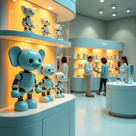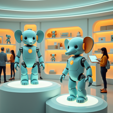 Generate an image of a futuristic retro store showcasing different models of friendly robot elephants designed to assist with daily tasks. The store has a clean, modern layout with bright, inviting yellow-orange lighting. The lights also should be glowing in the light blue colored shelves. The robots are displayed on rounded shelves in neatly arranged boxes. Each box features a minimalist design, highlighting the robot’s key features and the harmonious color palette: cool blues (#82b1ff, #2962ff) for the robot’s body and warm orange and yellow accents (#ff6f00, #ffc400, #ffe351).