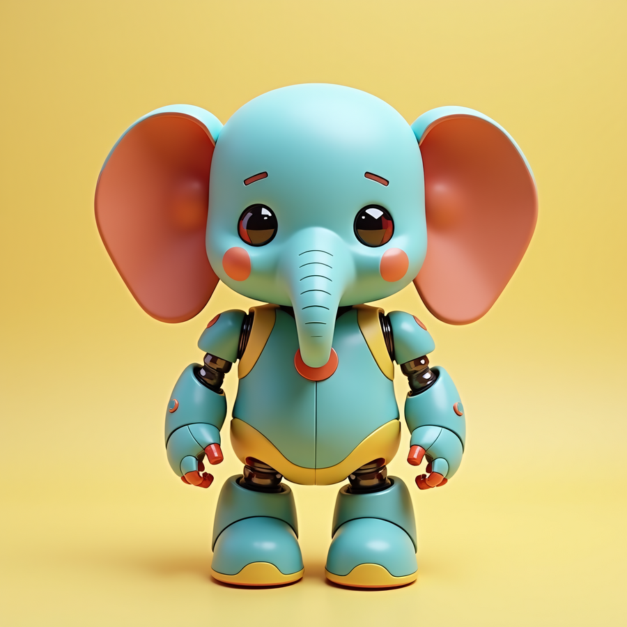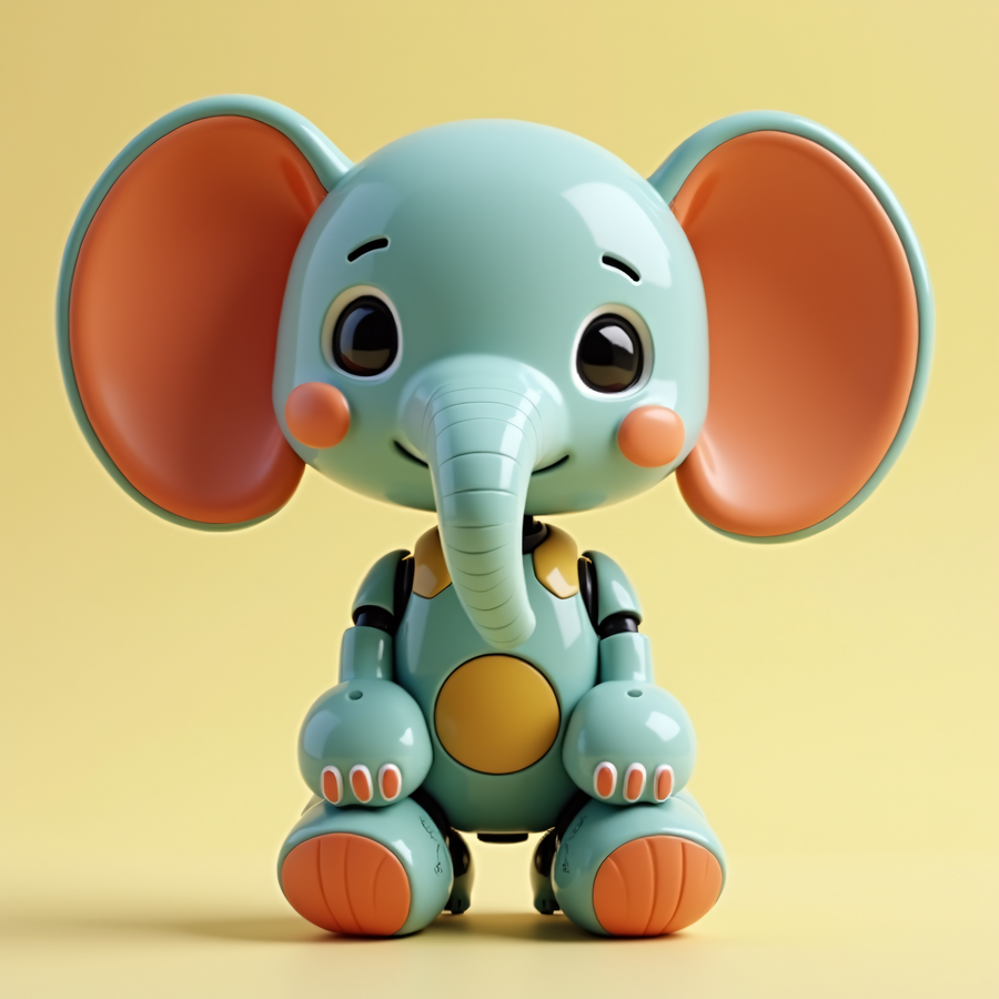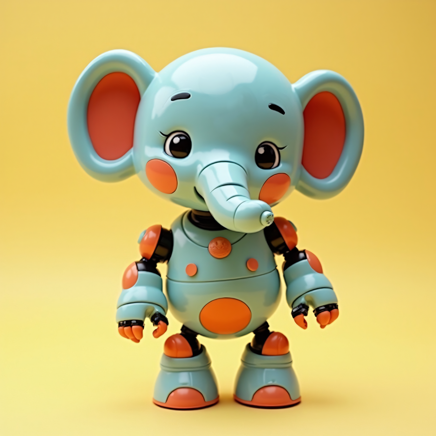 A cute, friendly robot elephant designed to help with daily tasks. The robot has cute red small plastic cheeks, big cute eyes, big ears, smooth simple design, rounded edges, approachable expression. Its body incorporates bright colors in a balanced way, primarily featuring cool blues (#82b1ff, #2962ff, #40c4ff) with warm oranges and yellows (#ff6f00, #ffc400, #ffe351) for accents. The robot elephant is big, human size, with subtle mechanical details like joints and soft LED lights that emphasize its helpful, calming nature. The design is sleek, uncluttered, and modern, emphasizing harmony and balance.