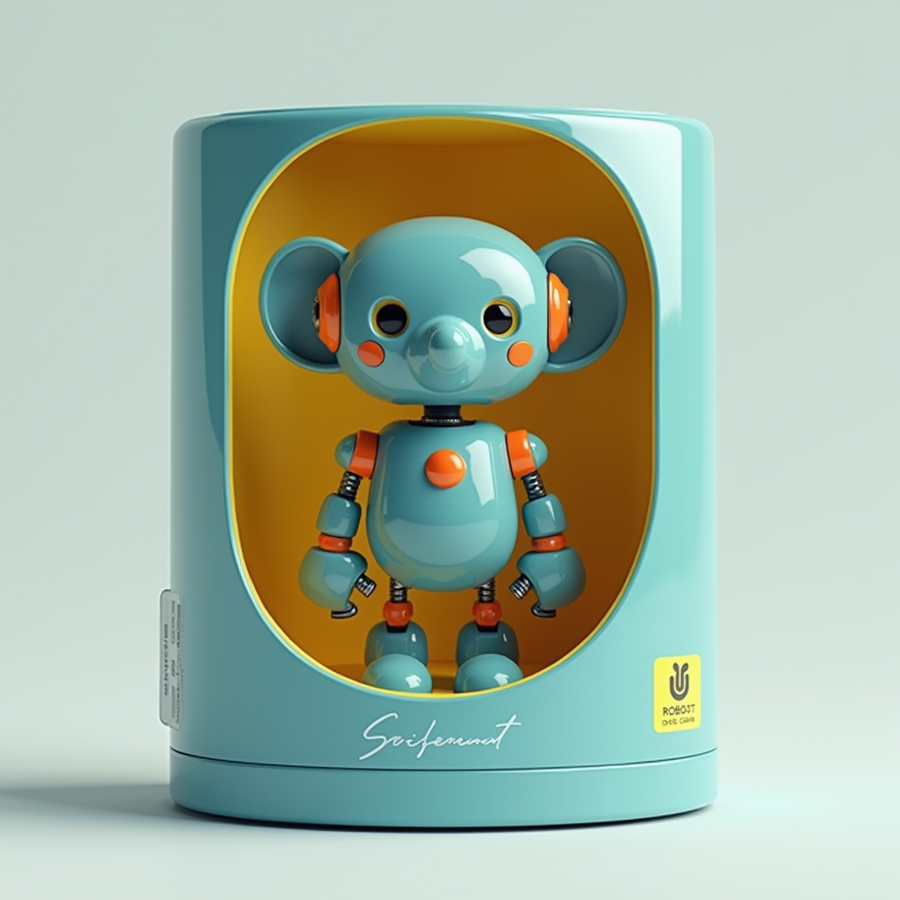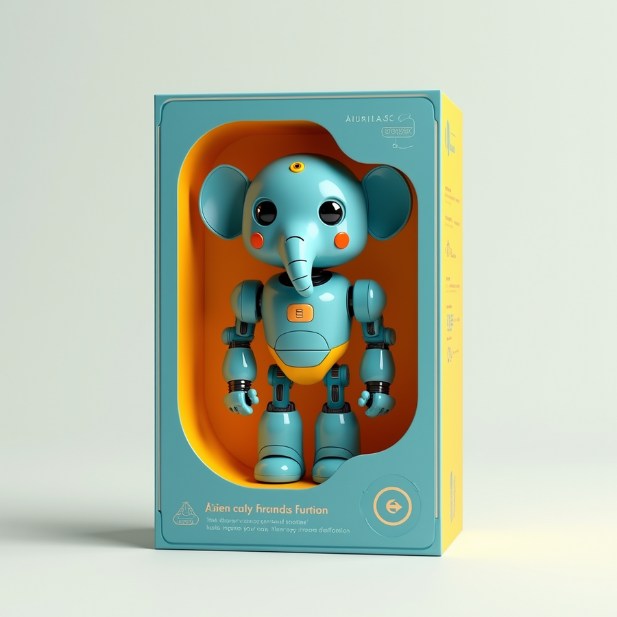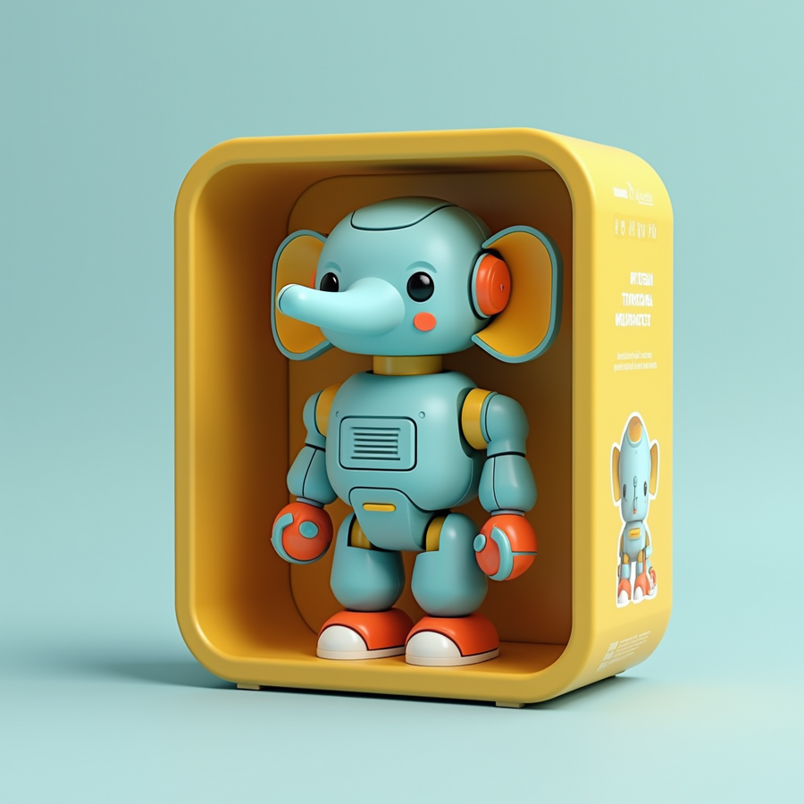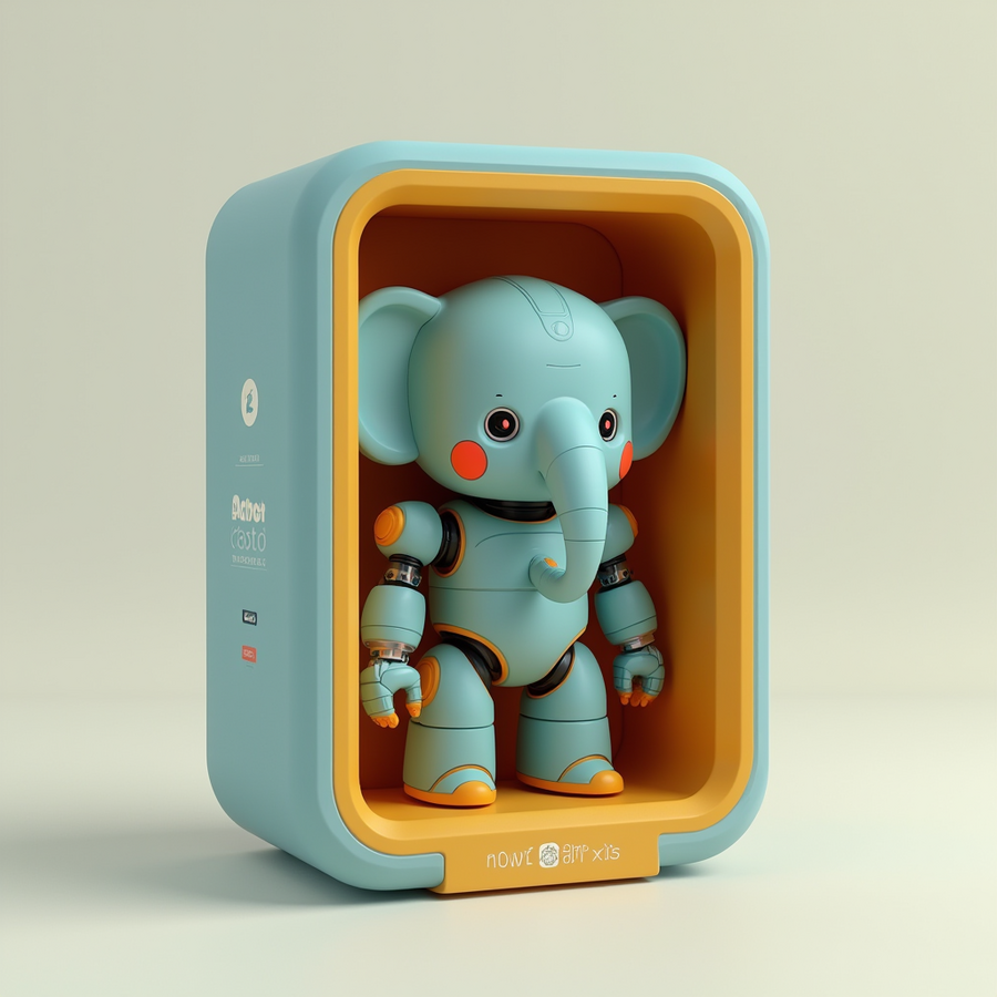 Create an image of a cute, friendly robot elephant displayed in a sleek, retro yet futuristic box with rounded edges. The robot elephant is designed to assist with daily tasks, featuring smooth, rounded edges and a minimalist design, has small red plastic cheeks, big eyes and big ears. The body has a harmonious color palette of cool blues (#82b1ff, #2962ff) with warm orange and yellow accents (#ff6f00, #ffc400, #ffe351).