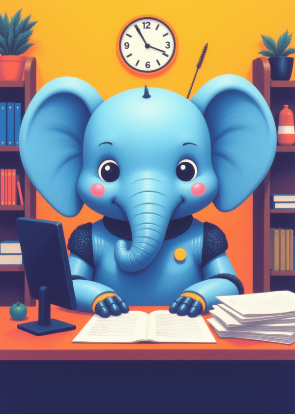 Create a commercial poster showcasing a futuristic robot-elephant. The robot has rounded design with bold outlines and a harmonious color palette of light cool blues (#82b1ff, #2962ff) for the body, accented with warm oranges and yellows (#ff6f00, #ffc400) to convey friendliness and energy, futuristic modern design with LED lights, cute design, big eyes and big ears. Robot in the center of the poster, sitting in the office at the table, working on a computer. There are also lots of papers on the table. There are a office cabinet and shelfs filled with document papers and books in the background and the clock on the wall. There also must be a BIG text below 'Take the rest, and we will do everything else' completed in a bold white rounded grotesk font. The overall style is simple 2d cartoonish cute with bold outlines and flat colors, no shadows, creating a vibrant and friendly atmosphere.