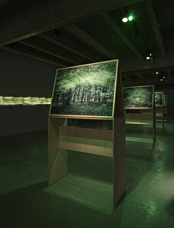 1 Photos displayed on a long shelf, with fluorescent lamps for lighting on the shelf behind the photographs. This creates a long green line — the forest itself or the «observator» is moving. Lamps light up the work and a little bit the wall.