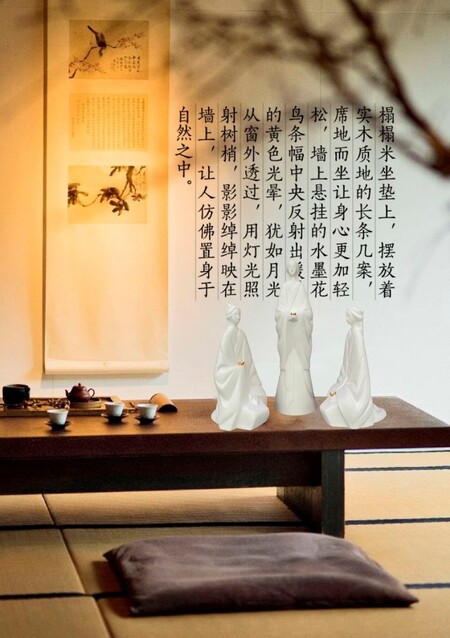 Позы скульптур отражают этикет китайской чайной церемонии, демонстрируя достоинство, торжественность и спокойствие. Скульптуры выполнены в минималистичном стиле, с акцентом на сгибах ткани и чашечках в руках. Образы визуально не перегружены, выглядят спокойно и непринужденно. Цвет фарфора подчеркивает красоту церемонии, выделает силуэты за счет благородного белоснежного цвета.