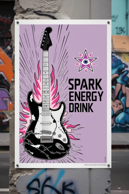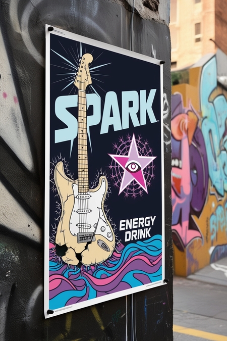 Scene of an urban street with a single poster for Spark energy drink displayed on a wall. The poster features a broken, hand-drawn electric guitar with psychedelic waves and energy fields radiating around it. The text 'Spark energy drink' is in bold, futuristic typography, with the minimalist logo—a star encased in barbed wire with an eye at the center in lilac and pink hues—next to the text. The poster is affixed to an urban wall, surrounded by graffiti and street art, giving the scene an edgy, vibrant atmosphere. The setting feels dynamic and creative, with the poster standing out against the backdrop of the street