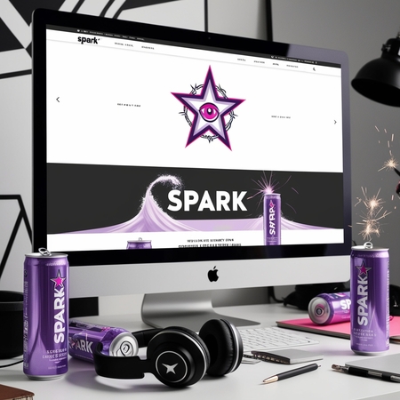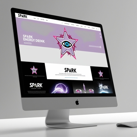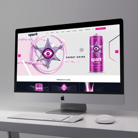 Image of a computer monitor displaying the website for Spark energy drink. The website features a sleek, modern design with a minimalist layout. The homepage prominently displays the Spark logo—a star encased in barbed wire with an eye at the center, in lilac and pink hues. The background is clean and monochrome, with bold typography for the brand name 'Spark.' The site includes dynamic sections showcasing the product, with energy-related visuals, such as glowing waves or sparks. The navigation is simple, with futuristic icons and easy-to-read fonts, reflecting the energetic and creative essence of the brand