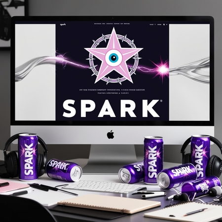 Image of a computer monitor displaying the website for Spark energy drink. The website has a sleek, modern design with a minimalist layout, featuring the Spark logo—a star encased in barbed wire with an eye at the center, in lilac and pink hues. The background is clean and monochrome, with bold typography for the brand name 'Spark.' The site showcases the product with dynamic visuals like glowing waves or sparks. The monitor is surrounded by empty Spark energy drink cans, scattered on a desk alongside other items like headphones, a notebook, and pens. The overall scene feels creative, energetic, and urban, reflecting the brand’s bold essence