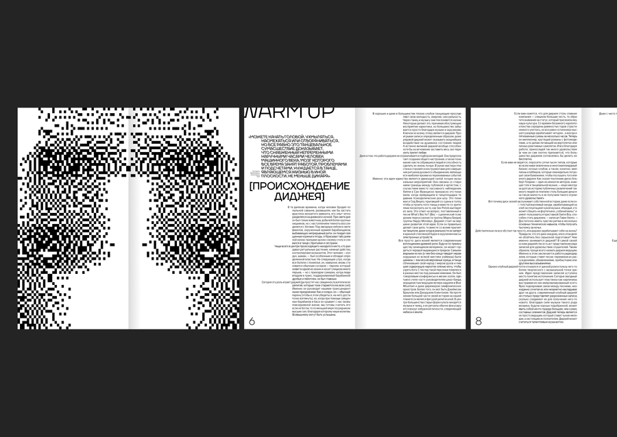 Трёхчастная структура зина и способ её эмоционального наполнения основан на одноименных названиях тональности и таймингов любого диджей-сета и целой вечеринки. Warm Up — разогрев. Prime Time — выступление хедлайнеров. After Party — тусовка до рассвета для тех, кто ещё в силах.