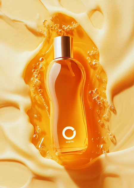 Midjourney prompt: Hyperrealisitc photo of cosmetic bottle interesting unusual shape with a shifted half, fluid shape, glass and matte material, orange color, laying in cream, view from the top, natural lighing