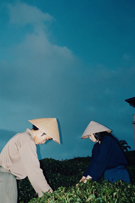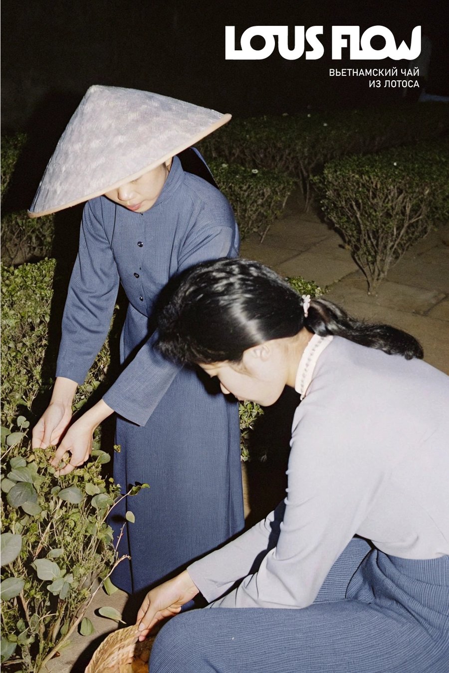 Promt: Create an image for a brand of Vietnamese lotus tea. It depicts Vietnamese people picking fresh tea leaves against the backdrop of a picturesque Vietnamese landscape. Use soft and harmonious colours to create an atmosphere of calm and tranquility.