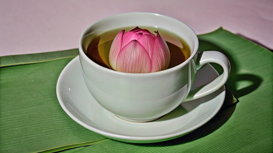 Promt: Create a mockup of a close-up mug filled with tea, with a large unopened lotus bud inside. The mug should be a minimalistic white colour. The background should be simple white colour with no obvious shadows, so as not to overload with details