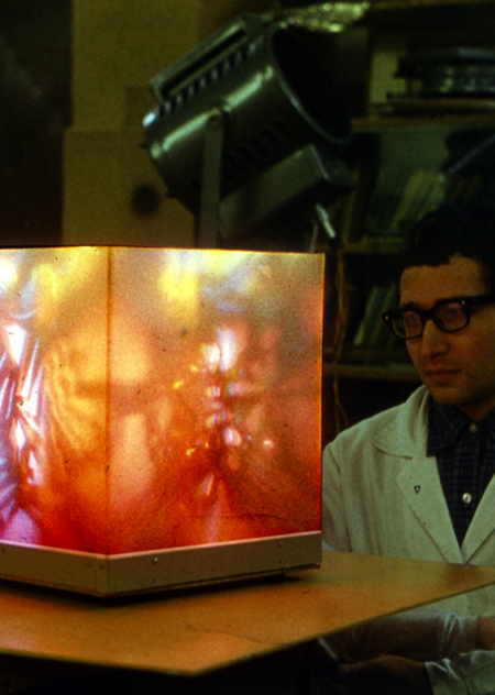 Первый вариант оптического устройства установки «Мондриан», рамки диапозитивов помещались цветные светофильтры —получаемая проекция напоминала произведения Пита Мондриана. 1972