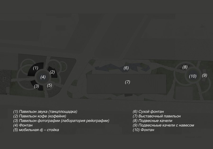 Концепция предлагает разделение территории парка на два основных смысловых пространства: активная зона с тремя павильонами —фотолабораторией, кофейней и крытой танцплощадкой, отражающая американскую массовую культуру и индустриальную силу, и, напротив, более камерная зеленая зона отдыха, пространство тишины, вдохновленная европейской культурой.