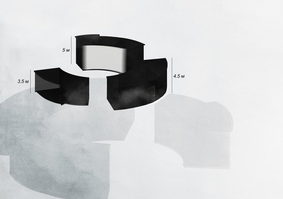 Фасады павильонов выполнены из тёмного матового металла и тонированного архитектурного стекла, создавая игру бликов и теней в зависимости от времени суток. В каждый павильон встроены мультимедийные экраны, трансформирующие здания в кинотеатр. Здесь проходят показы экспериментального кино, архивных лент и медиа-инсталляции, посвященных Ман Рэю.