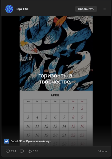 Клип же залетел лучше всего, набрав 4,3 тысячи просмотров за 10 дней. И это несмотря на то, что паблик ВК был создан недавно и этот клип был там первой публикацией. Алгоритмы ВК работают таким образом что любой контент начинает набирать виральные охваты, если он понравился подписчикам паблика и они много лайкали и просматривали его. То есть тенденция такова, что ВК сам начинает показывать клип в ленте и продвигать его, если он изначально понравился подписчикам паблика. Я пропросила друзей и знакомых подписаться на мою группу, а потом лайкнуть и сделать репост моего поста в первый час после публикации. Лайков и репостов набралось немного, так как в группе было около 25 подписчиков, однако ВК распознал клип как популярный среди подписчиков группы и начал продвигать его в своей ленте, что помогло собрать большие охваты.