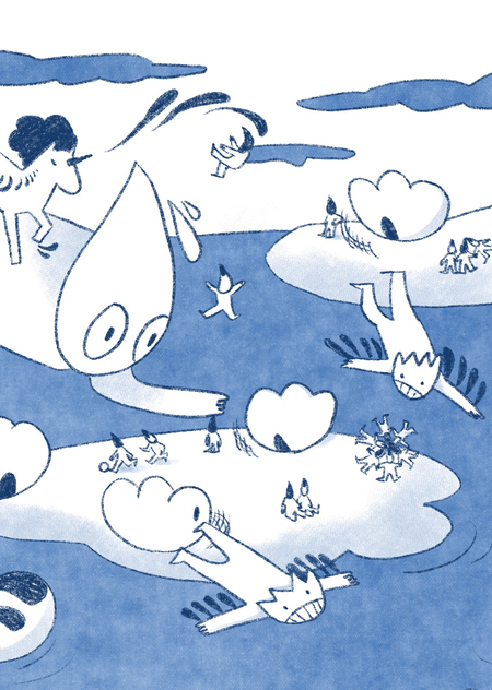 В Гжельгороде по соседству живут рыба-тигр и гжельрог. Над островами вытягивается фигура человека-капли, вокруг него кружат летуны, а по суше ходят гжители. Узоры расплываются по небу, и магия завивается