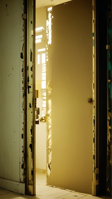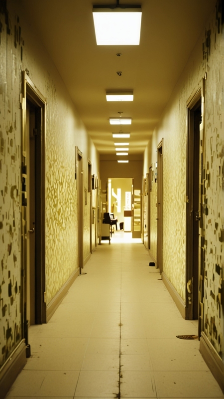 Generate a liminal space scene in the style of the Backrooms: a long, empty office hallway with fluorescent yellow lighting, repeating ceiling panels, and rows of identical desks and chairs. The room should feel sterile and slightly unsettling. Include subtle visual noise or slight VHS-like distortion to enhance the eerie, dreamlike quality. The far end of the hallway should fade into warm light, creating a false sense of depth. No people, no windows to the outside, only artificial light and sterile surfaces. The atmosphere should evoke loneliness, confusion, and a sense of being trapped in an endless bureaucratic loop.
