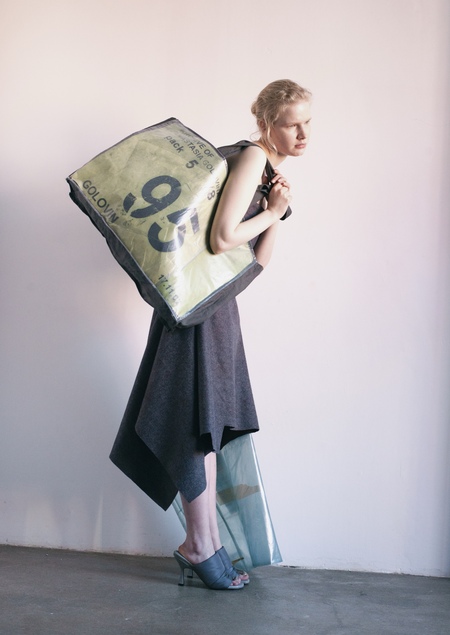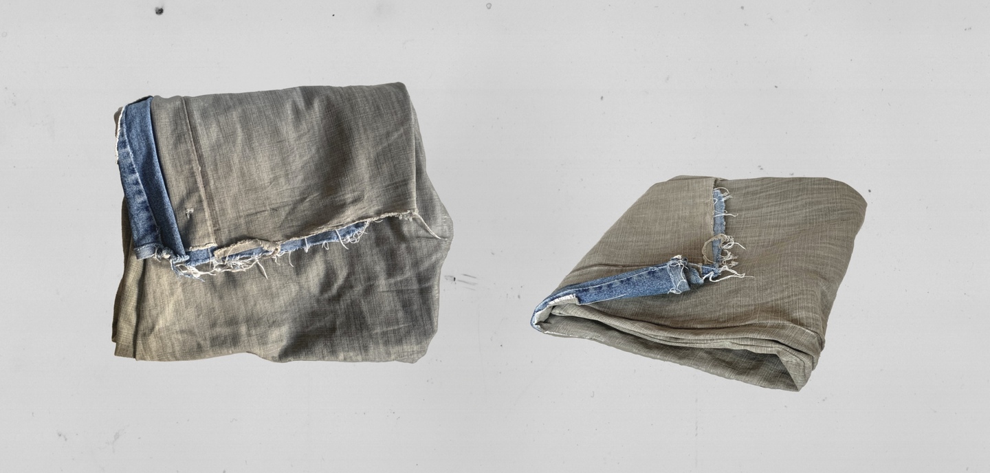 2. Джинсы из гардероба моего папы — очень важный и сигнатурный для моего творчества элемент. Считаю, что уход папы повлиял на всю мою жизнь и сформировал меня как человека и дизайнера. От того, что человек не носит одежду, джинсы хранятся в сложенном состоянии, на одном месте, тем самым теряя прямое назначение. Они превращаются в предмет. Сейчас я поняла, что я люблю заимствовать мужской гардероб в своем дизайне включая, силуэт, ассортимент, фасон, сдержаные цвета.