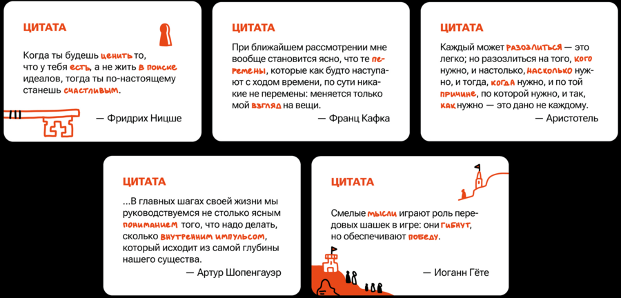Цитаты — это колода карт с философскими цитатами разных времен и авторов. Задача игроков — обсудить смысл высказываний и возможное применение этих идей к решению своей задачи.