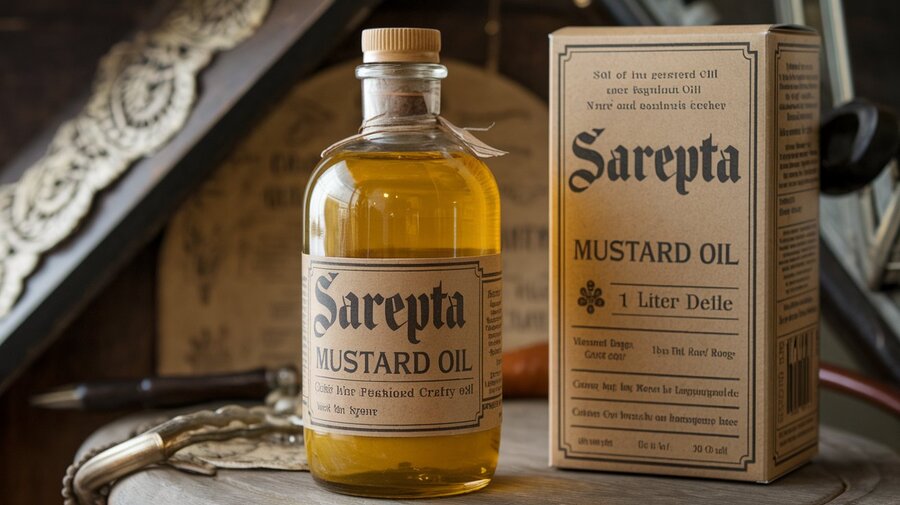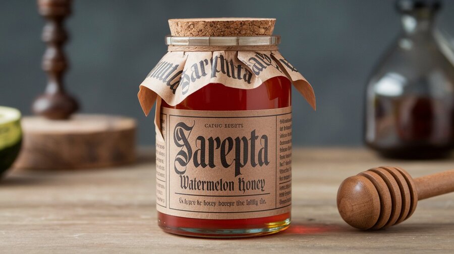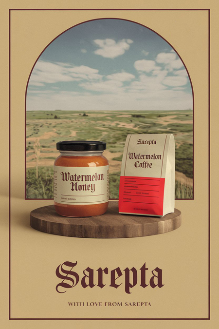 1. A photo of a vintage-style watermelon coffee packaging for 'Sarepta', a coffee brand named in honor of the German settlement near Volgograd. The packaging is a vertical and narrow, light brown box package with a vintage design. The box has a hand-crafted style and features a light brown background with the text «Sarepta Watermelon Coffee» in a gothic font. There are no illustrations on the packaging. A few coffee beans are scattered next to the package 2. A photo of a vintage-style packaging for 'Sarepta' watermelon honey. The packaging is made of glass and has a cork stopper. The label is printed on a brown paper and wrapped around the jar. The label has a gothic font. The background should be calm 3. A photo of a vintage glass bottle containing 1 liter of mustard oil for 'Sarepta'. The bottle is placed on a wooden surface. The packaging has a vintage design with a gothic font and an old-fashioned crafty style. Next to the bottle, there is a wide box of oil with a label. The background contains old-fashioned, crafty-style decor. The box should be commensurate with the bottle, and the color of the oil should not be too yellow, more like regular oil