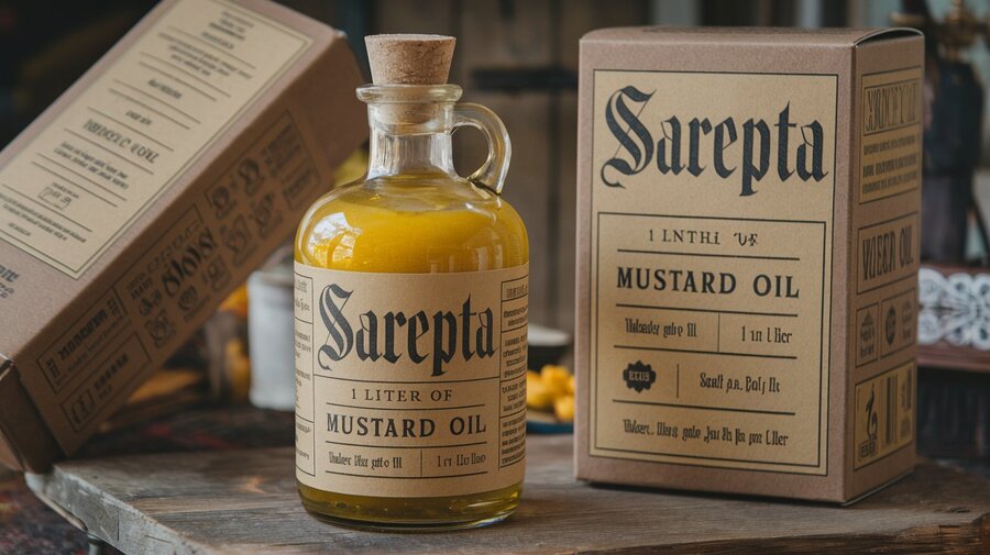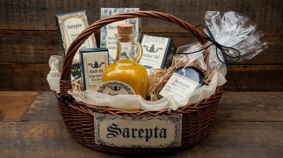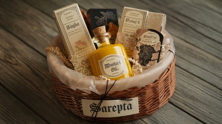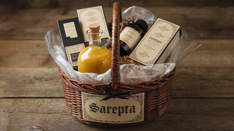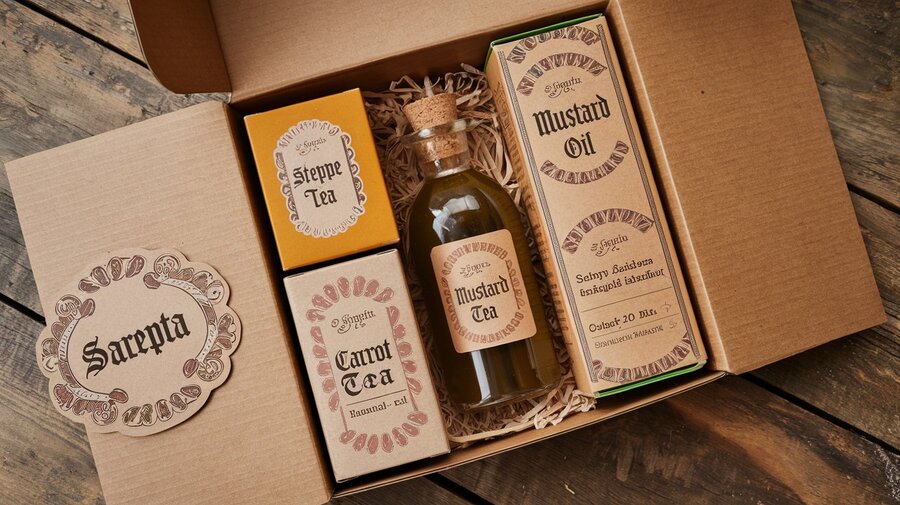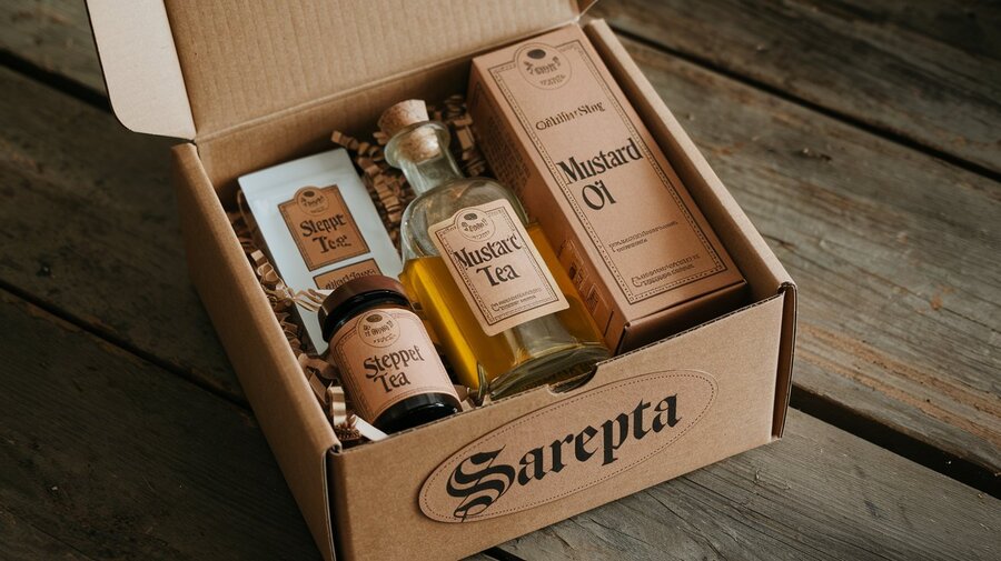 /imagine prompt: 1. A photo of an opened kraft box on a wooden surface. Inside the box, there are various products, including steppe tea, carrot tea, mustard tea, and mustard oil. The mustard oil is in a glass bottle with a cork stopper. Next to the bottle, there is a wide box of oil with a label. The design of the products contains old-fashioned, crafty-style decor. The label on the basket has the text 'Sarepta' in a gothic font 2. A photo of a basket filled with various products, including a mustard oil in a glass bottle with a cork stopper and a wide box of oil with a label. The basket is placed on a wooden surface. The design of the products contains old-fashioned, crafty-style decor. The basket is wrapped in chiffon film and tied with black thread. The label on the basket has the text 'Sarepta' in a gothic font. The basket has one large support handle and is wrapped in cellophane film and tied with black thread