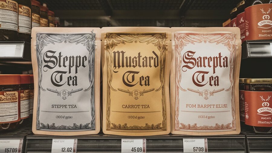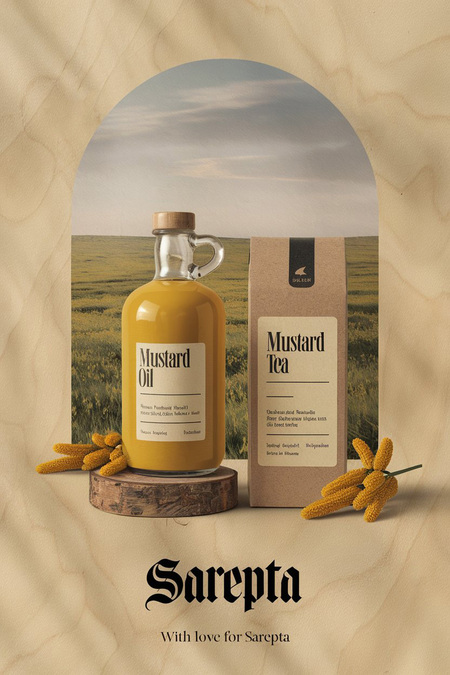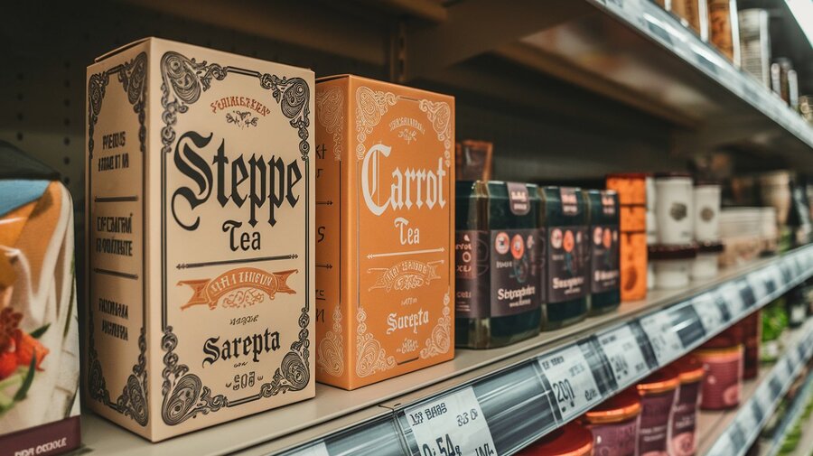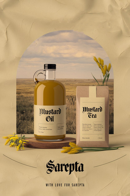 1. A photo of a vintage mustard tea packaging for 'Sarepta', named in honor of the German settlement near Volgograd. The packaging has a vintage design with a gothic font and an old-fashioned crafty style. next to the packaging, There is a metal cylindrical jar for brewing tea. The jar contains the yellowish mustard tea. There’s also a transparent cup with a plate, filled with the tea, placed next to the jar 2. A photo of a vintage-style packaging for 'Sarepta' steppe tea and carrot tea. The packaging has a gothic font and an old-fashioned crafty style. The background is a light and calm setting, with a few herbs and tea bags placed on a wooden board. There’s a rustic basket beside the board 3. A photo of a vintage-style three-packaging, one for steppe tea, next for mustard tea and another for carrot tea for 'Sarepta', displayed on a supermarket shelf. The packaging is designed in a gothic font and an old-fashioned craft style. They are placed next to other products. The overall atmosphere of the image is warm and modern