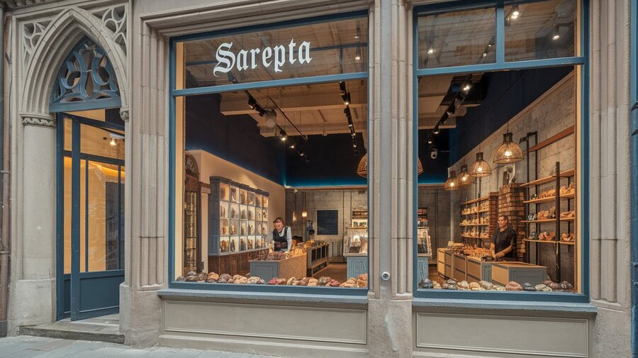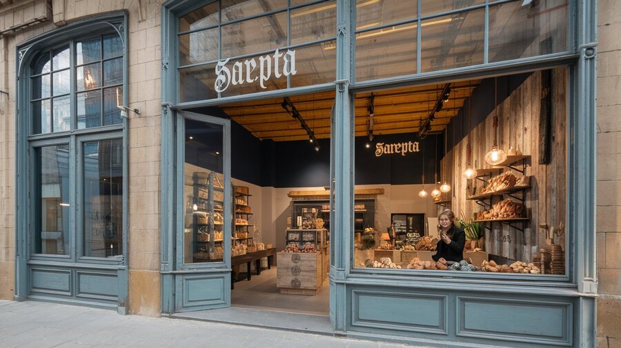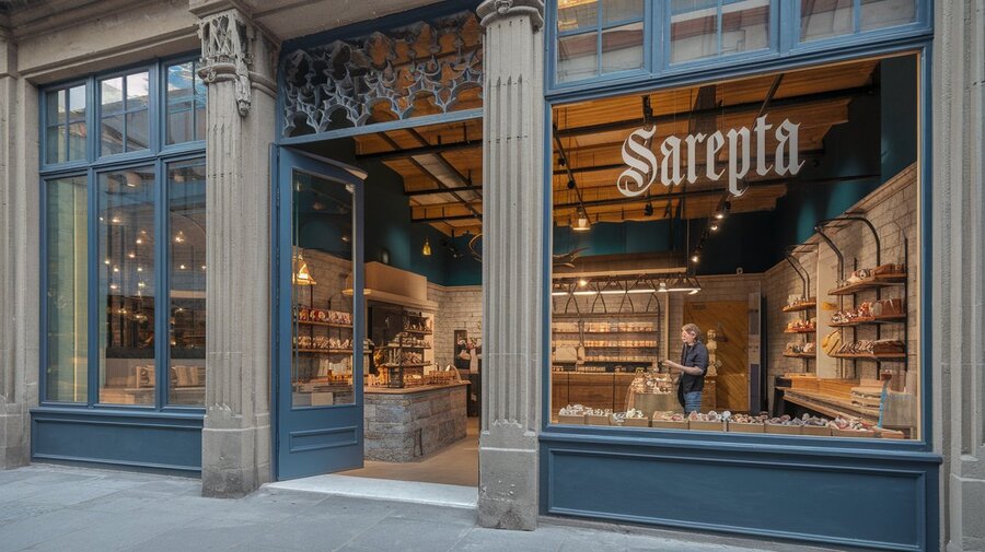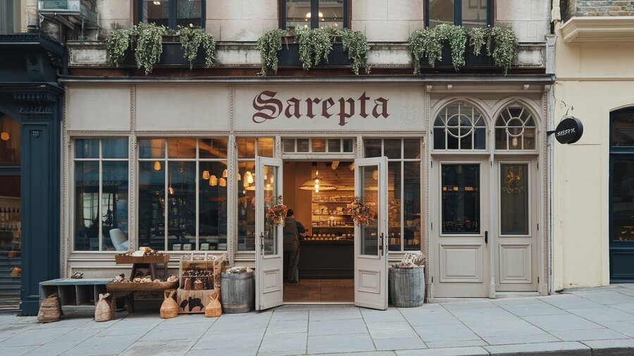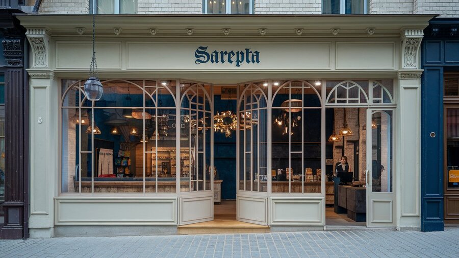 /imagine prompt: A photo of a modern exterior building with a vintage design, named «Sarepta». The building has a gothic font and an old-fashioned crafty style. The building’s style is countryside and fairly minimalist. The space is located in a modern city and occupies 2 floors of the building. The exterior has high ceilings, and the windows are 5 meters high. Through the windows, we can see a modern store interior with a rustic design theme named «Sarepta». The decor combines natural wood textures and muted, earthy colors, complemented by dark blue and warm lighting that creates an inviting atmosphere. A counter displays a range of locally produced goods, and a cashier assists customers, reinforcing the shop’s artisanal and heritage-inspired branding